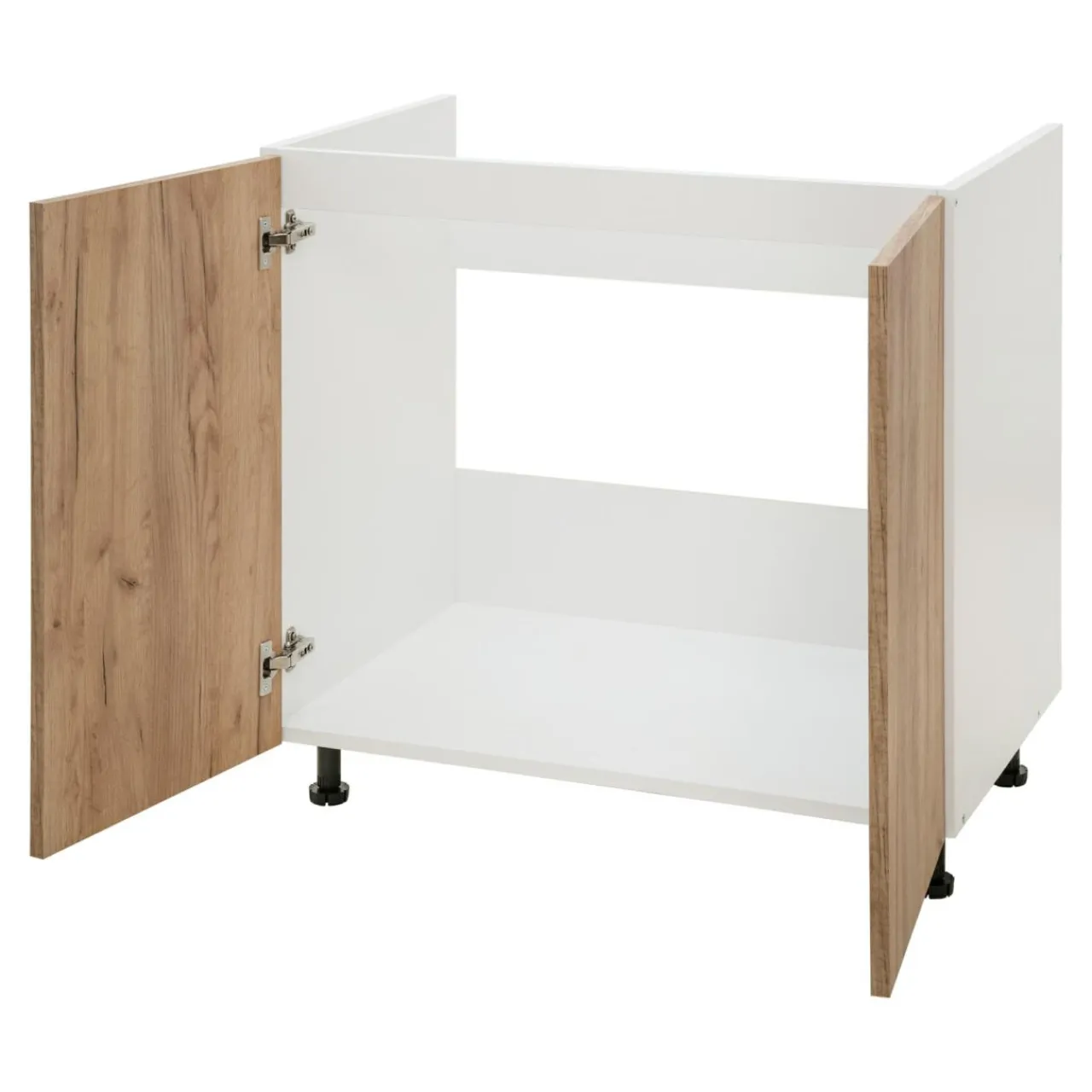 Model szafki BASIC PLUS BP/D80Z świetnie sprawdza się w kameralnym wnętrzu, a front szafki został wykończony laminatem. Biały kolor korpusu oraz front w kolorze drewna złoty dąb craft są doskonałą bazą dla zestawienia z jasną kolorystyką pozostałych mebli wchodzących w skład kuchennej aranżacji.