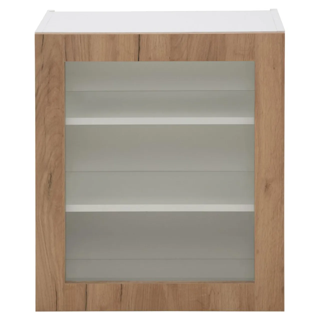 Szeroka na 60 i wysoka na 72 cm idealnie sprawdza się przy nowoczesnej aranżacji kuchennego wnętrza. Front szafki został wykończony szkłem oraz płytą meblową laminowaną, w kolorze dąb craft złoty. Jego kolorystyka dodaje ciepła i naturalności oraz rozjaśnia optycznie przestrzeń. Świetnie wygląda w połączeniu zarówno z ciepłym, jak i z chłodnym wnętrzem, a charakterystyczna dla dębu faktura drewna dodaje całości elegancji.