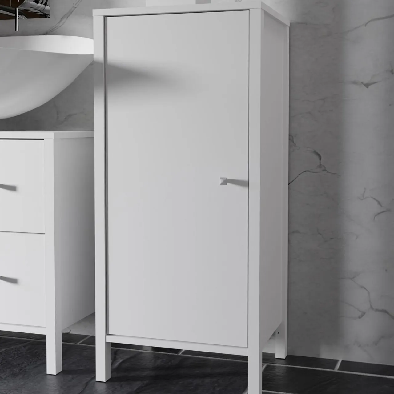 W komodzie IPSARION znajdują się 2 wysokie wnęki, w których bez problemu przechowasz zapasową chemię, ręczniki i pozostałe akcesoria łazienkowe.