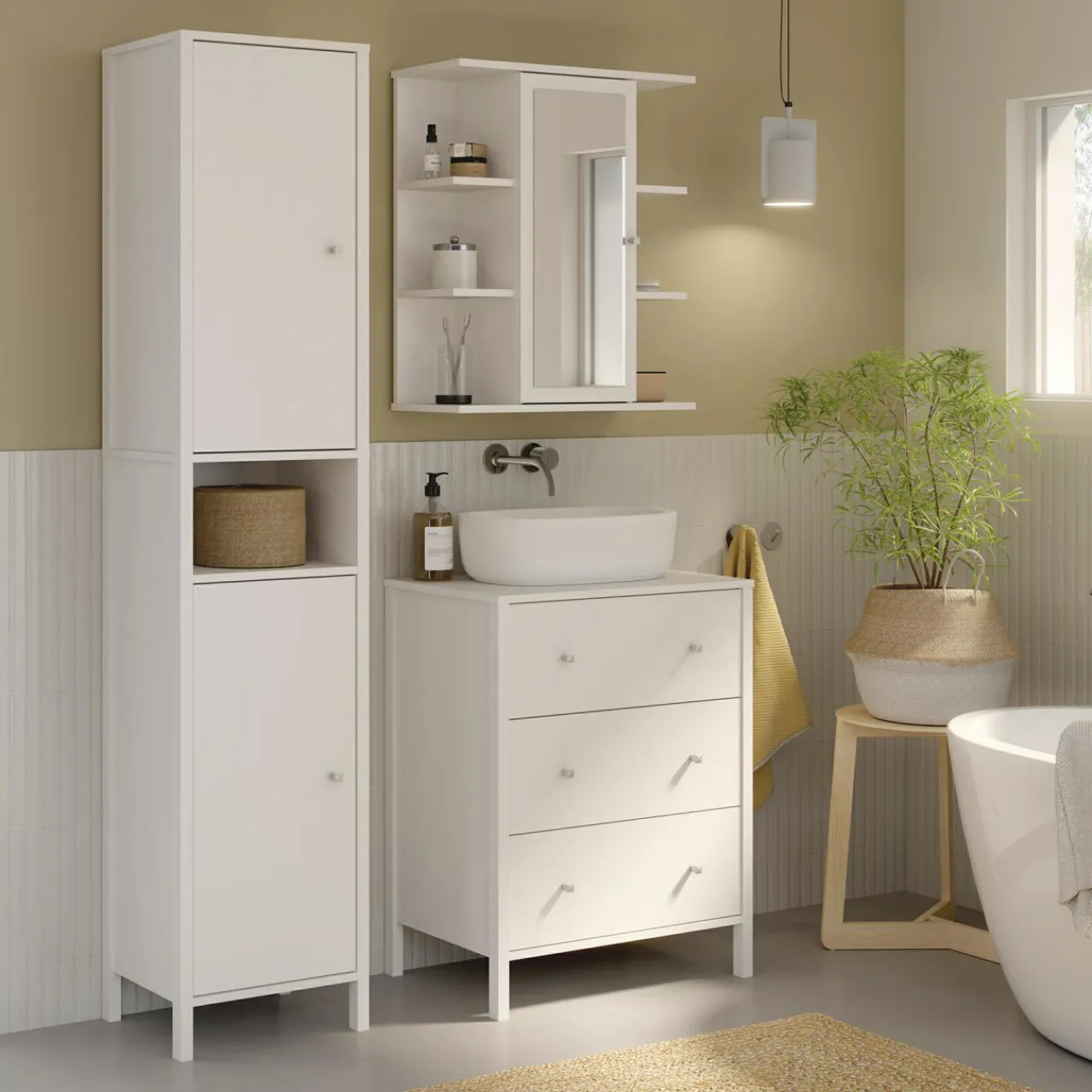 Półka wisząca ułatwi organizację drobnych przedmiotów w łazience, a długie lustro będzie nieocenionym pomocnikiem porannej lub wieczornej pielęgnacji.