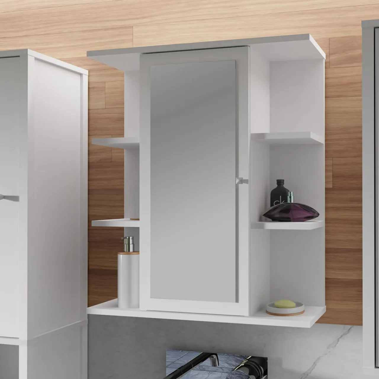 - W szafce ukrytej za szklaną taflą przechowasz kosmetyki oraz lekarstwa.