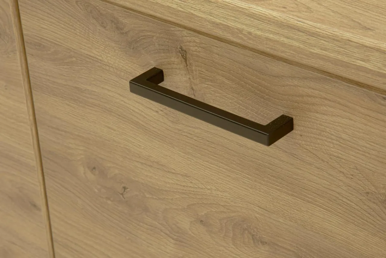 Proste, czarne uchwyty sprawiają, że meble z tej kolekcji pasują do wnętrz urządzonych zarówno w stylu klasycznym, jak i nowoczesnym.