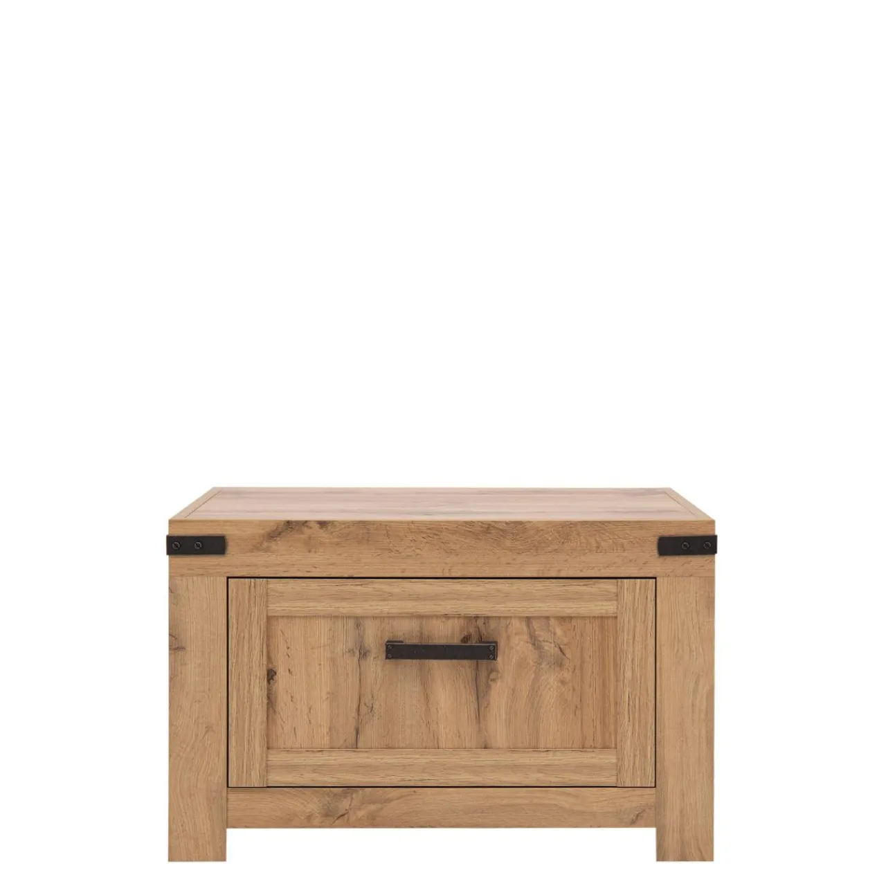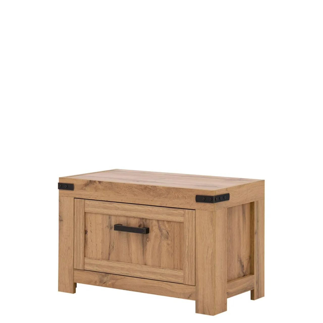 Kolor laminatu przypomina wygląd surowego drewna. Pod szafką na buty znajduje się przestrzeń, ułatwiająca pracę odkurzaczem.