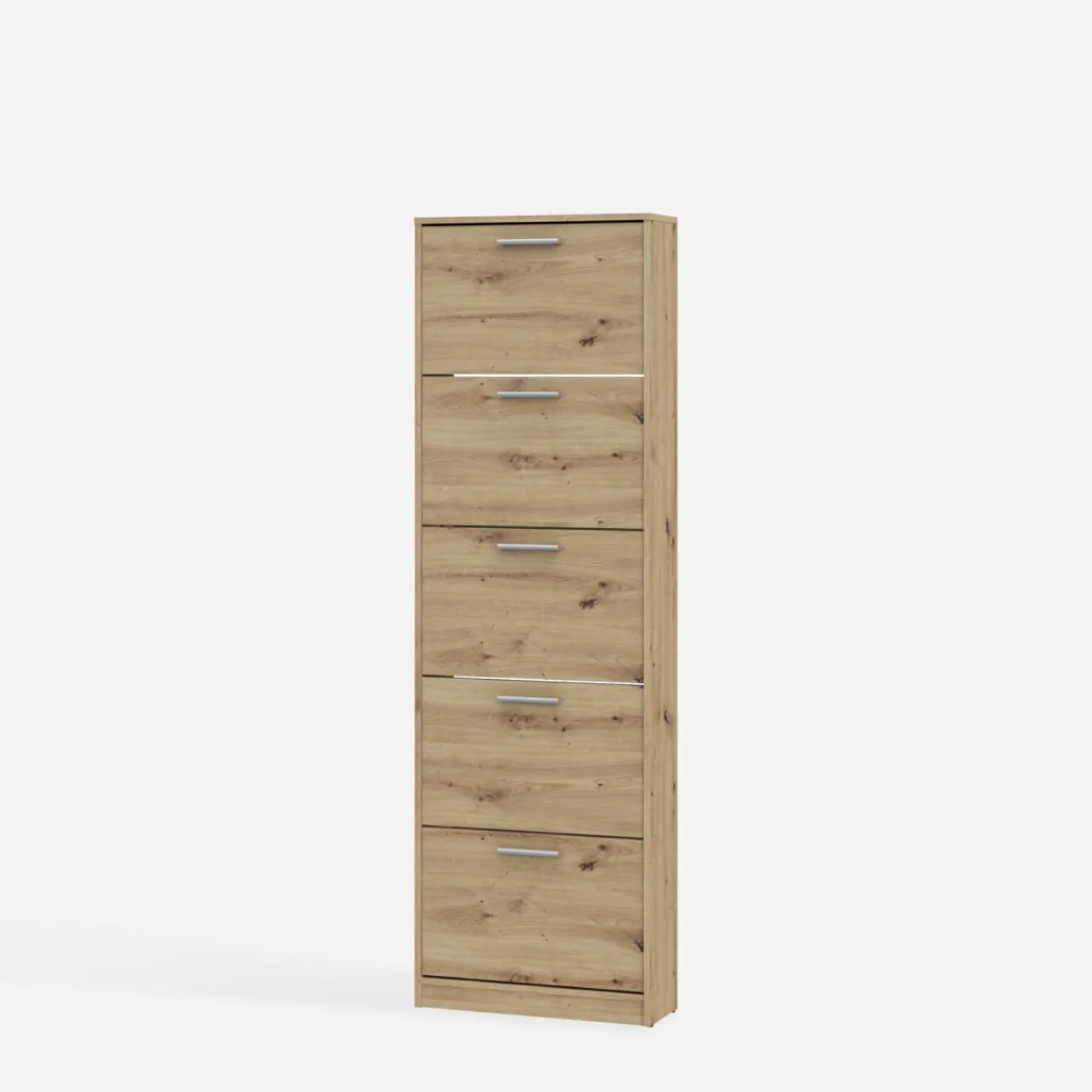 Szafka NOCII to wysoka, smukła konstrukcja idealna do przedpokoju, która pozwala przechowywać większą ilość obuwia dzięki pięciu uchylnym szufladom.