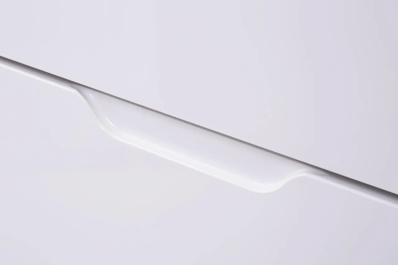 - Szafka wykonana jest z płyt meblowych i wykończona folią. Białe, połyskujące fronty rozświetlą mały przedpokój.