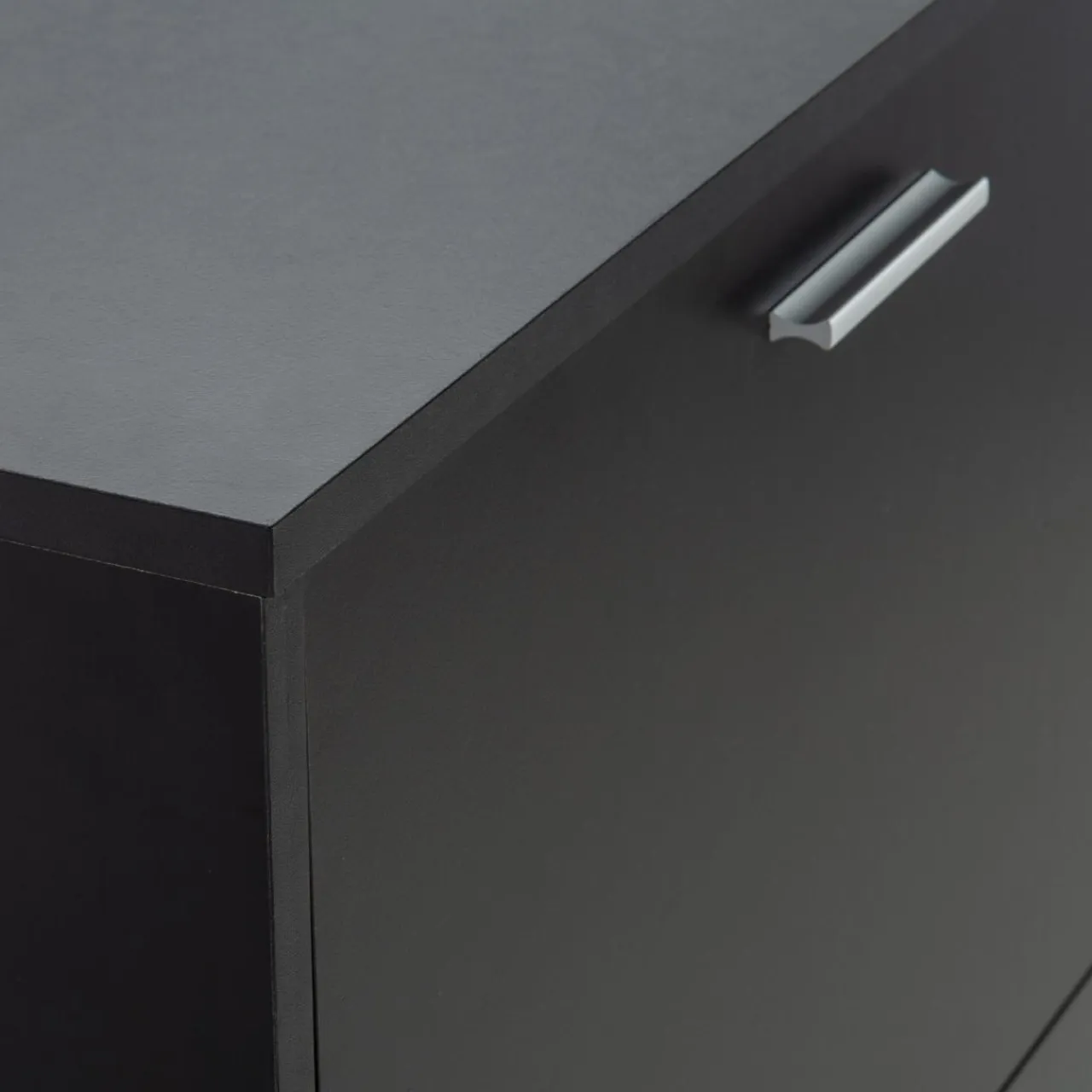 Gładkie fronty w kolorze głębokiej czerni i metalowe proste uchwyty prezentują się elegancko.