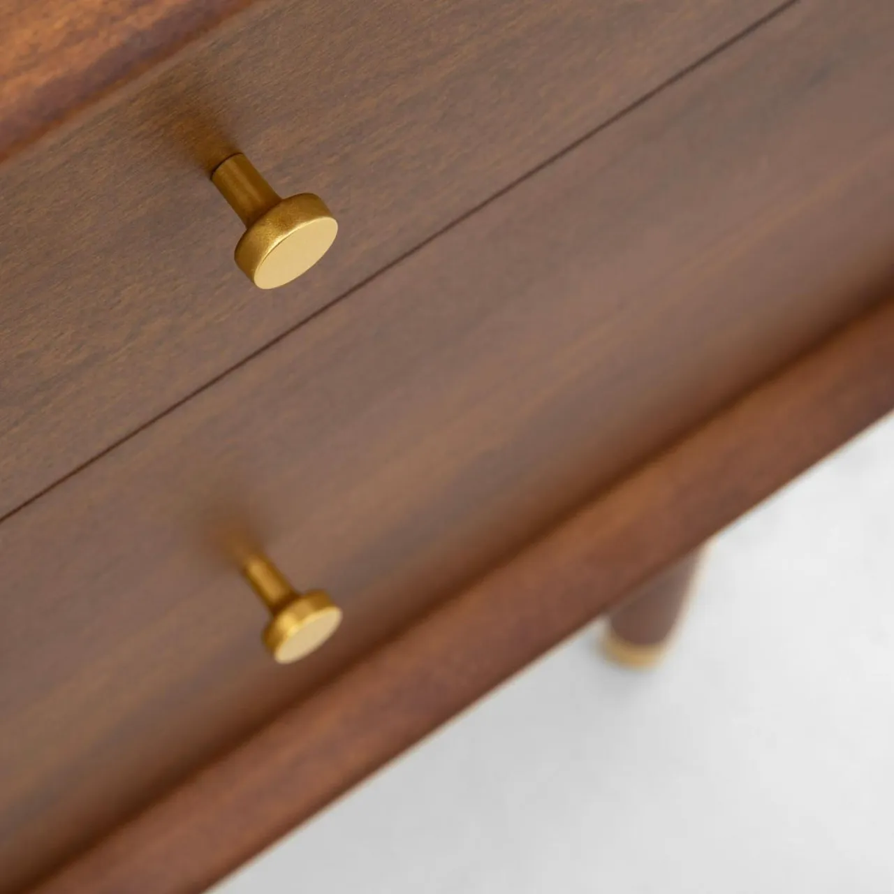 Minimalistyczne akcenty z mosiądzu w postaci uchwytów i końcówek nóżek podkreślają jakość wykonanych mebli.