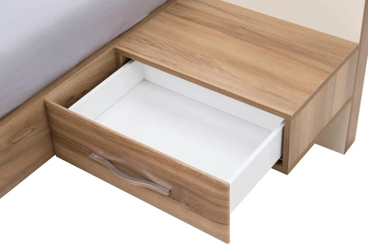 Szafka nocna GALA uzupełnia łóżko z kolekcji. Doskonale spełnia swoją podręczną rolę stoliczka z szufladą, na którym można odłożyć telefon, książkę lub herbatę, dodatkowo wzbogacając walory estetyczne sypialni.