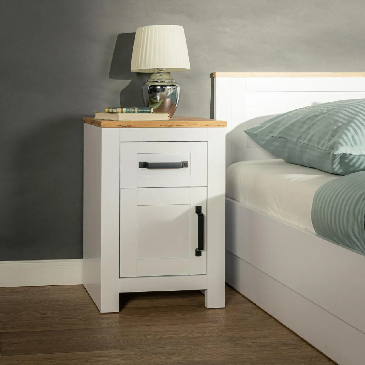 Na blacie postaw nocną lampkę oraz budzik. Nie zabraknie miejsca na szklankę wody.