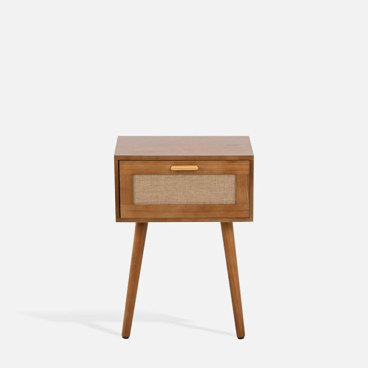 Szafka nocna CALAMO wyróżnia się bursztynowym odcieniem drewna i plecionym zdobieniem na froncie. Akcentu w stylu boho świetnie łączy się ze złotym cynkowym uchwytem i skośnymi nogami z litej sosny.