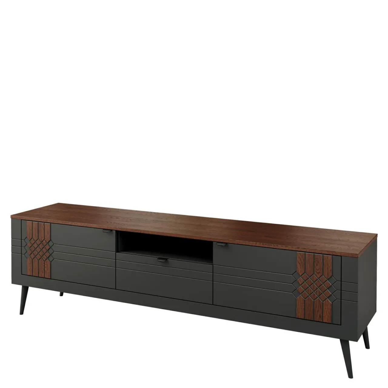 Szafka RTV HARMONY dzięki pięknym geometrycznym żłobieniom na frontach i wykorzystaniu naturalnego drewna wprowadzi do Twojego wnętrza odrobinę luksusu.