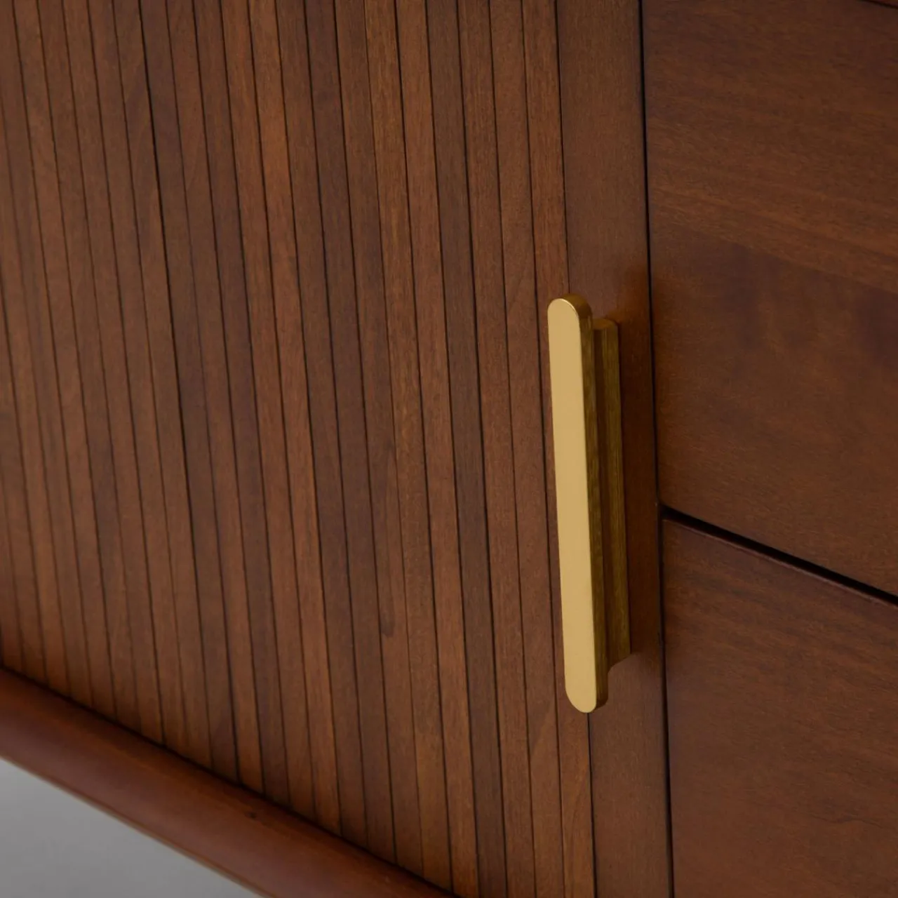 Minimalistyczne akcenty z mosiądzu w postaci uchwytów i końcówek nóżek podkreślają jakość wykonanych mebli.