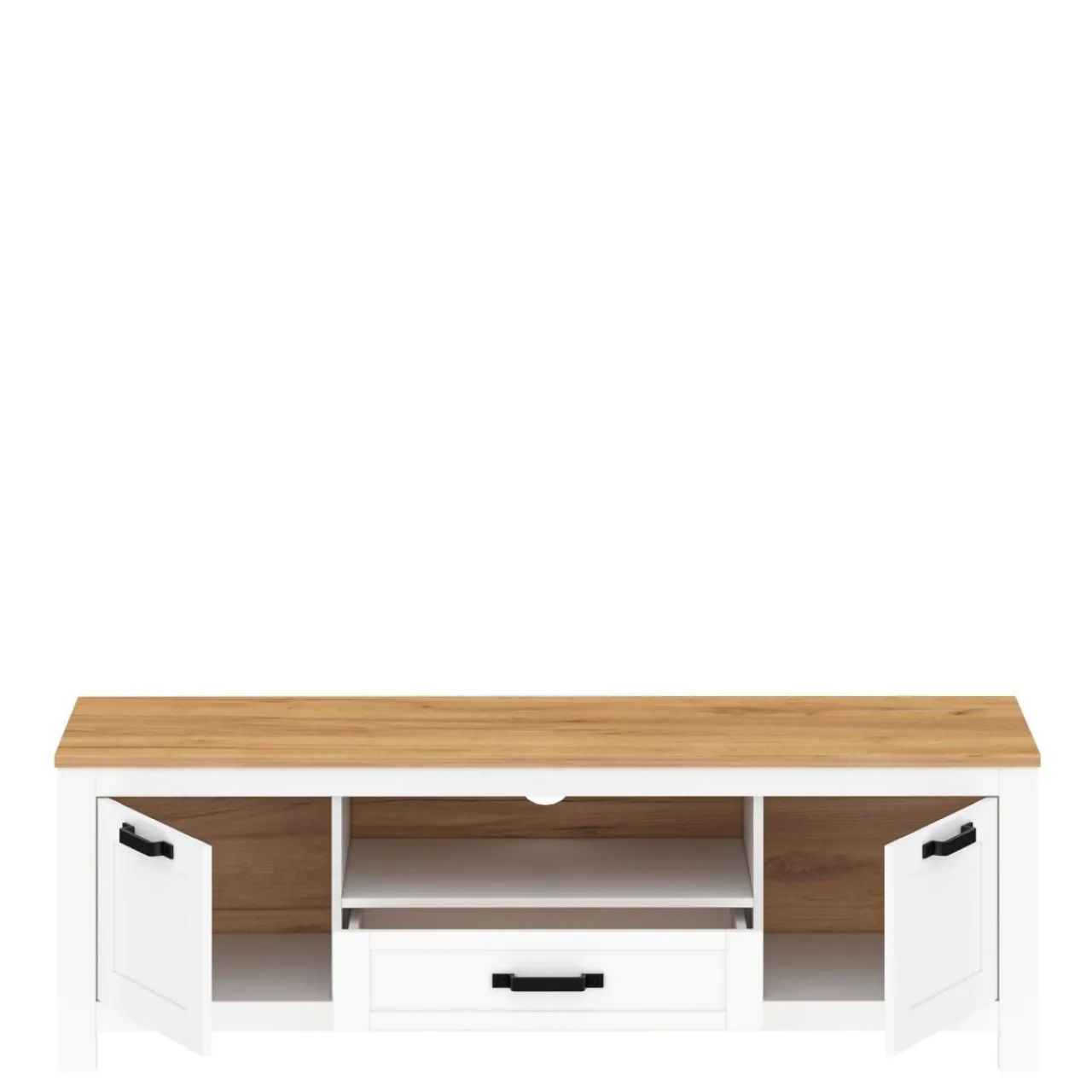 RTV LANZETTE posiada 2 zamykane szafki, natomiast jej centralna część mieści otwartą półkę oraz szufladę na prowadnicach kulkowych.