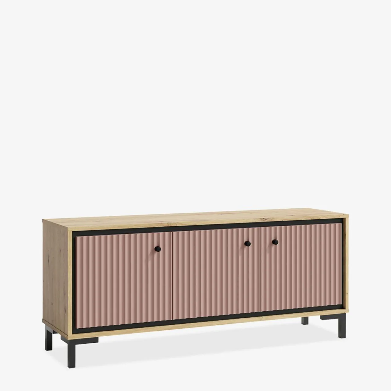 Odmień wnętrze swojego salonu dzięki frontom do szafki RTV z kolekcji PARII. Wierzch frontów w kolorze różowym matowym wyróżnia się ozdobnym ryflowaniem. Ryflowanie jest wyraźnie wyczuwalne pod palcami. Dzięki żłobieniom fronty lekko załamują światło padające do pokoju dziennego tworząc ciekawy efekt światłocienia 3D, który zachwyci Twoich gości i domowników.