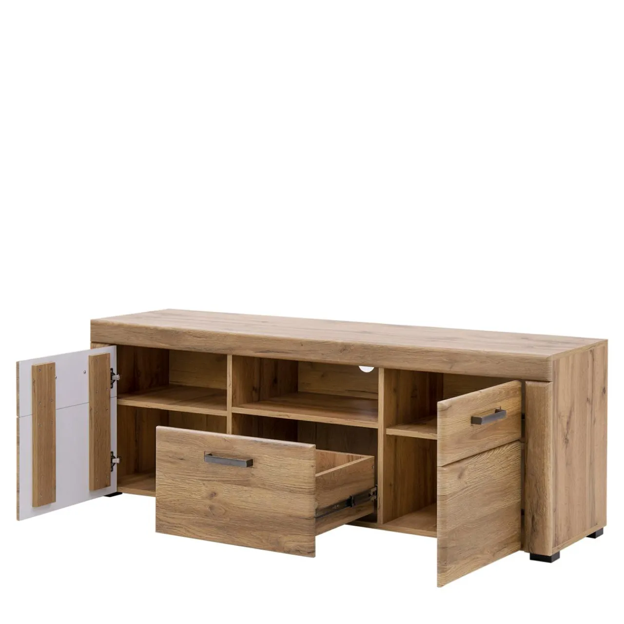 - Umieszczona pośrodku pod blatem otwarta wnęka to idealne miejsce na dekoder czy konsolę. Umieszczony z tyłu otwór pozwala ukryć nieestetycznie wyglądające kable.