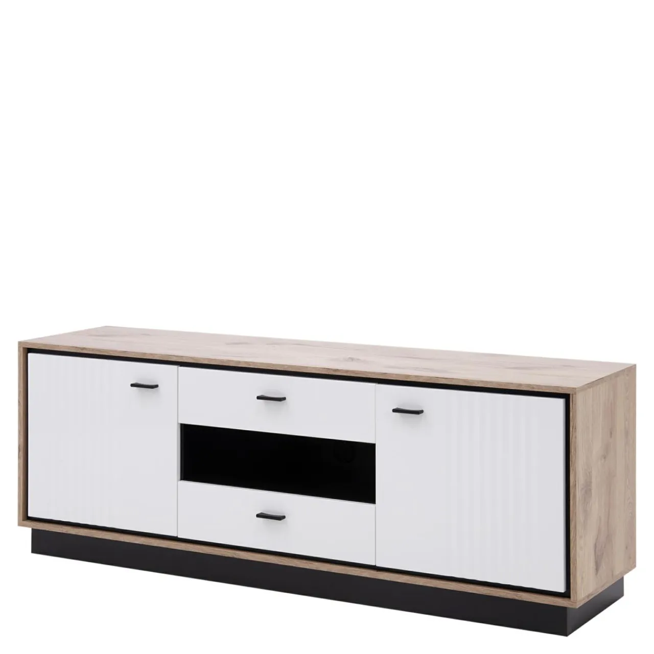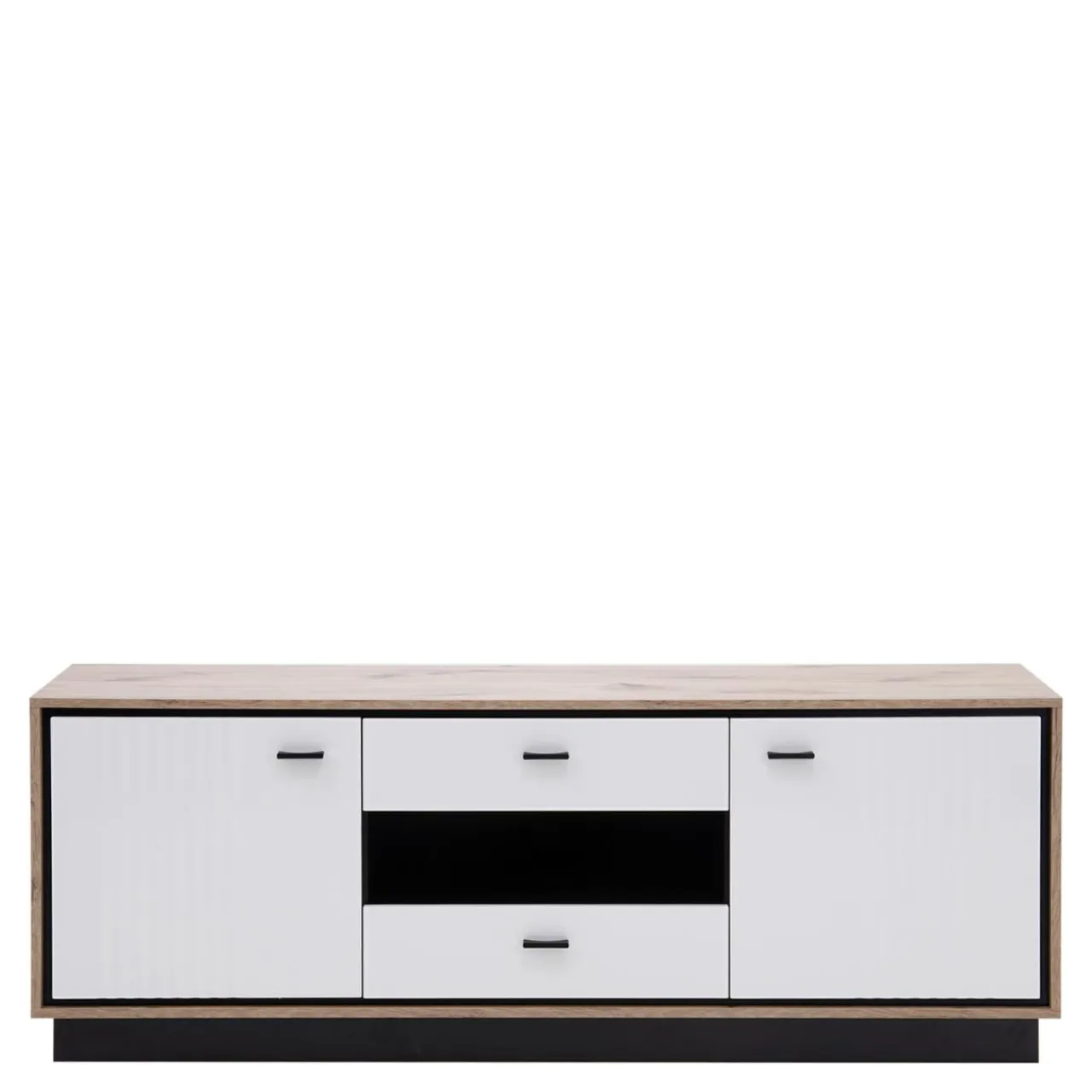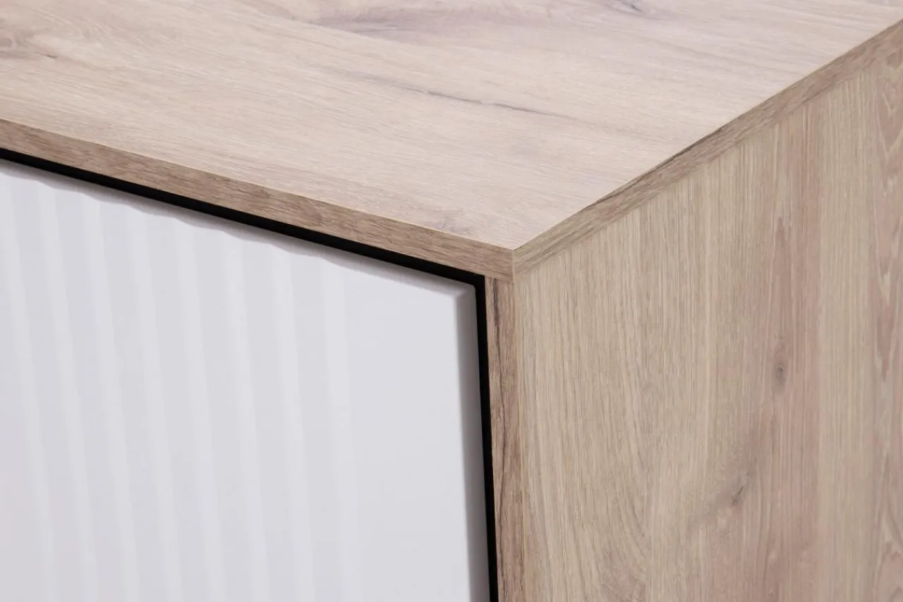 Klasyka zaprezentowana w modernistycznym wydaniu. Bryły skonstruowane są w przemyślany sposób: korpusy w jasnym kolorze dębu postawione są na czarnych podstawach, a całość zamykają białe fronty.