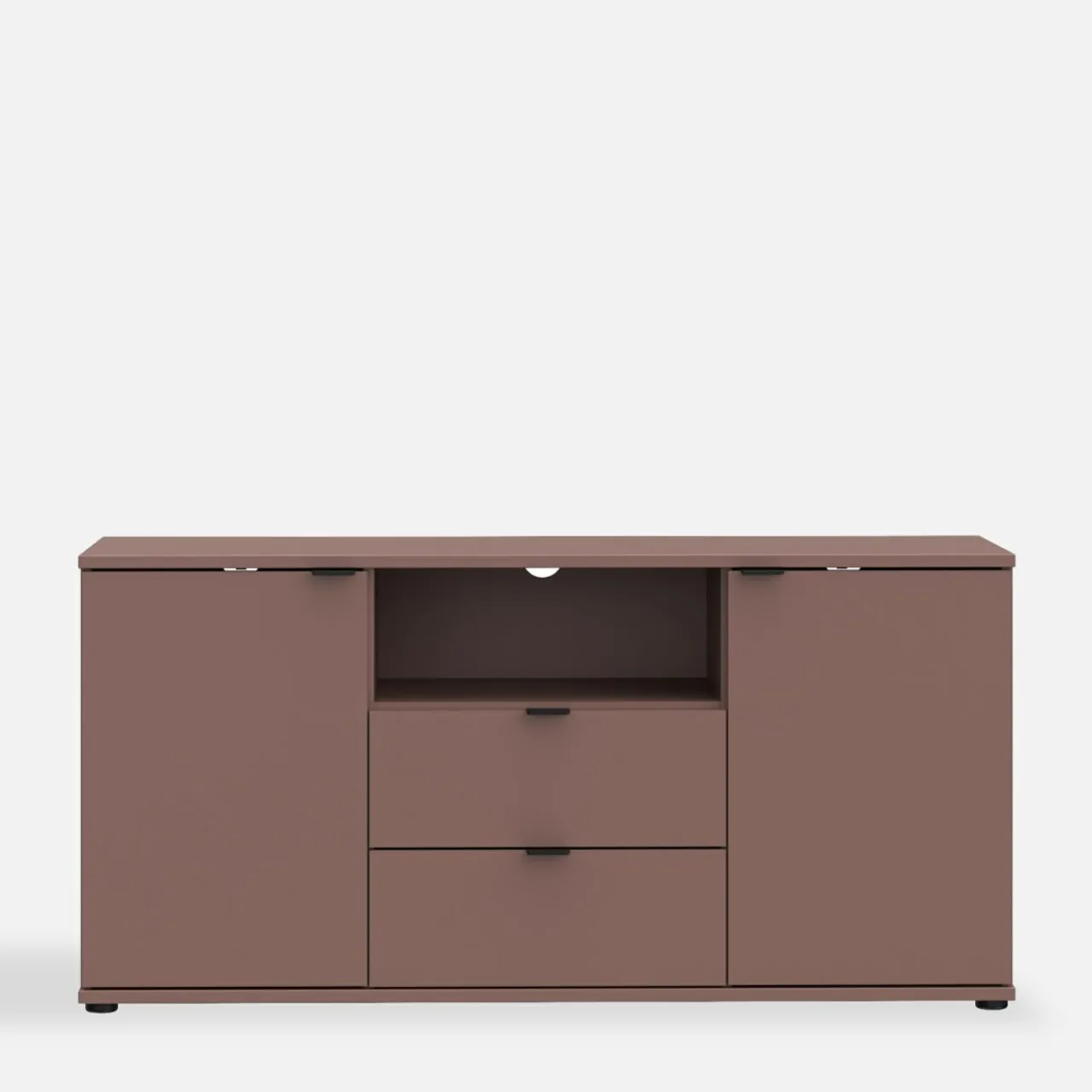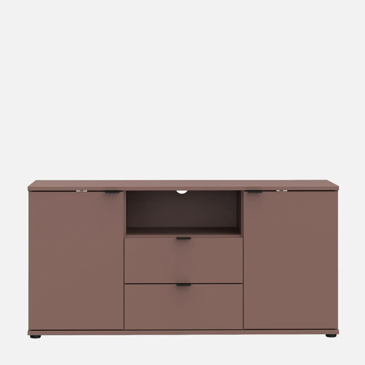Szafka RTV GANYMEDE w odcieniu terrakoty zapewnia miejsce na sprzęt elektroniczny i akcesoria. Zamykane szafki ukryją większe przedmioty, a szuflady i wnęka ułatwią organizację.