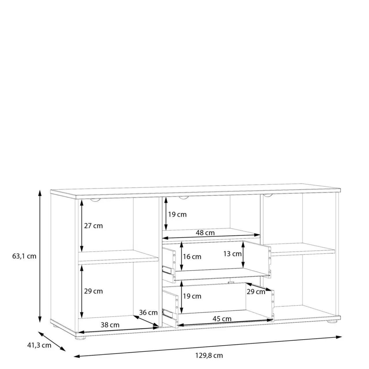 - 2 zamykane szafki z półkami, 2 szuflady oraz wnęka na sprzęt RTV.