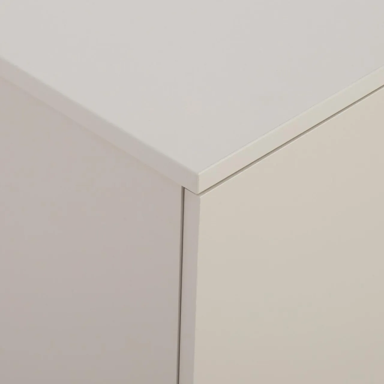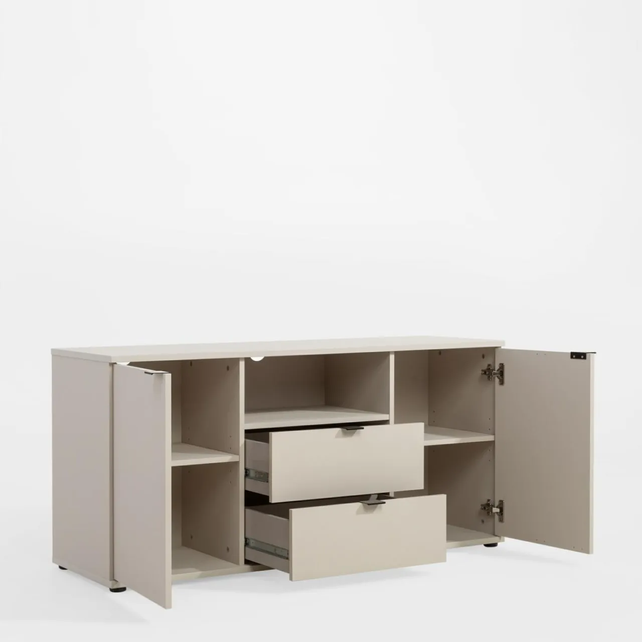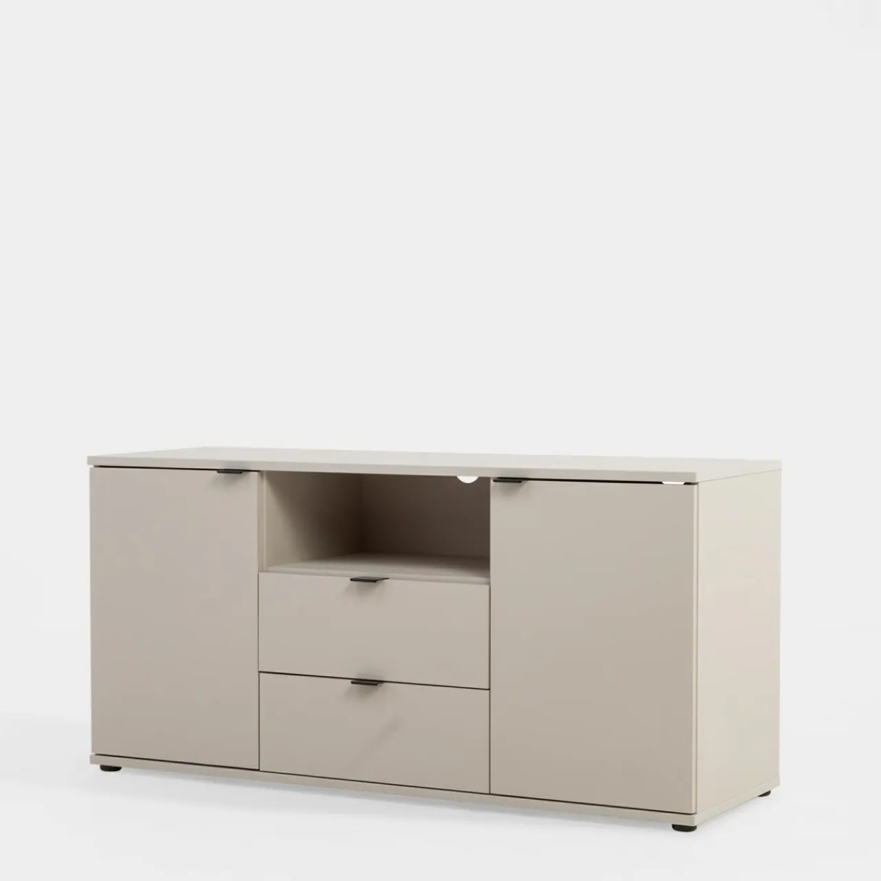 Szafka RTV GANYMEDE w odcieniu jasnego beżu zapewnia miejsce na sprzęt elektroniczny i akcesoria. Zamykane szafki ukryją większe przedmioty, a szuflady i wnęka ułatwią organizację.