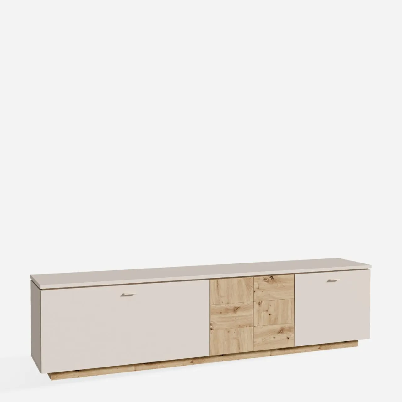 Szafka RTV LOUOTO ma aż 224,8 cm szerokości. Zabudujesz nią ścianę pod telewizorem, a nawet mniejszym kinem domowym.