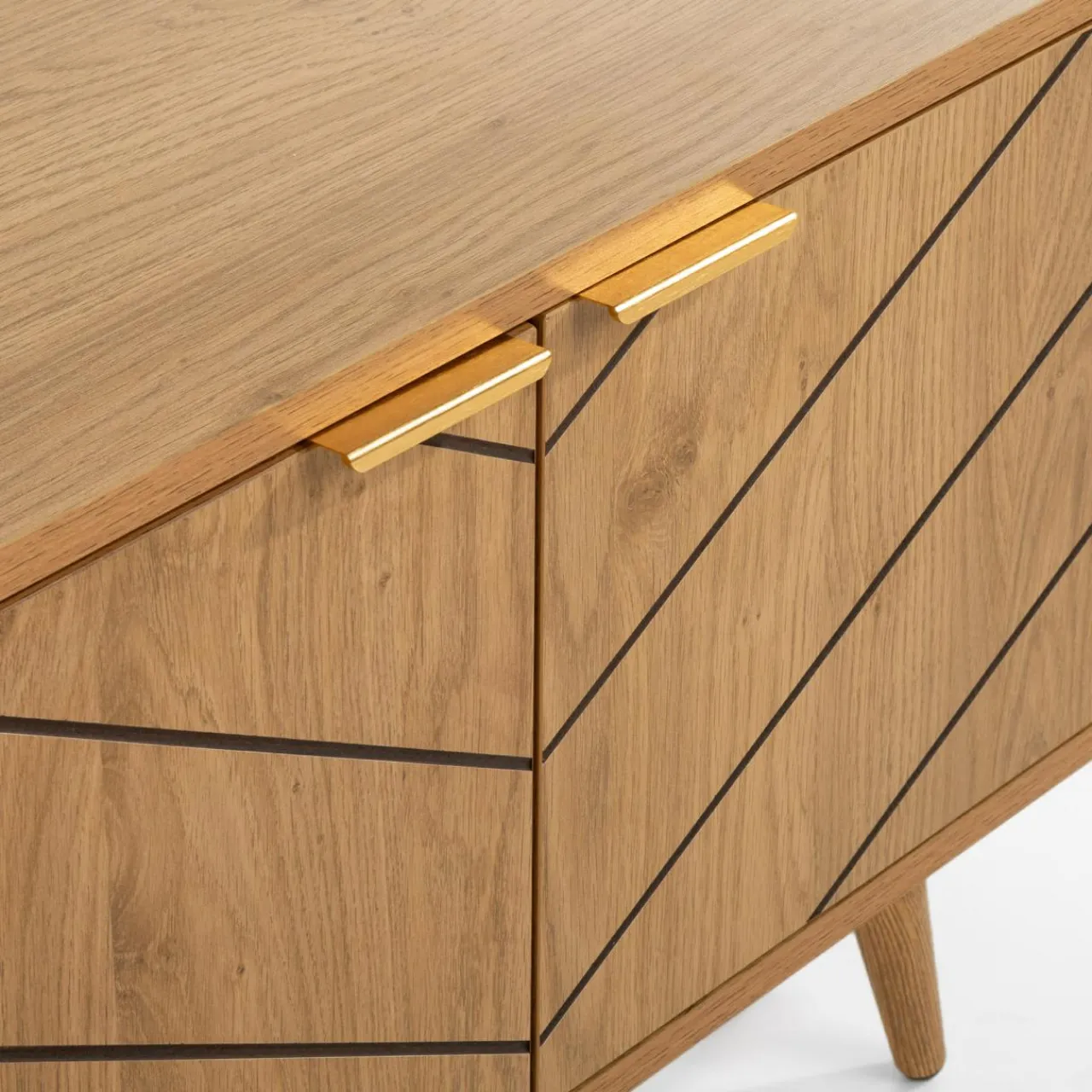 - Uchwyty i nogi w barwach podobnych do mebli dodatkowo podkreślają ciepły kolor wykończenia.