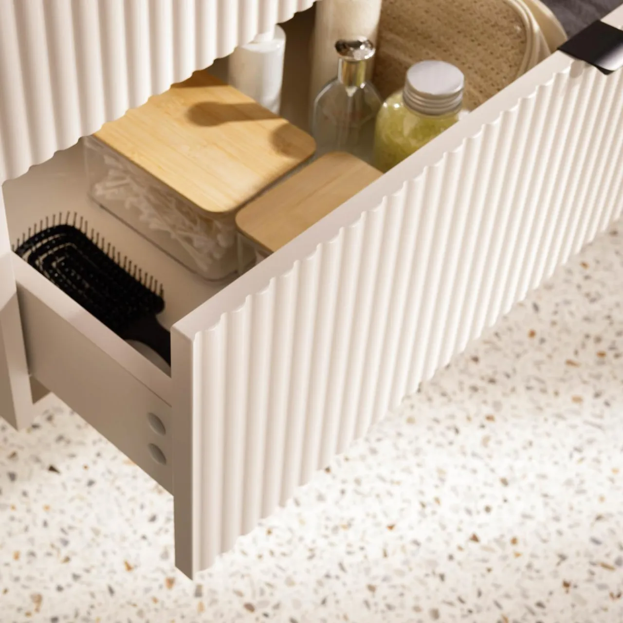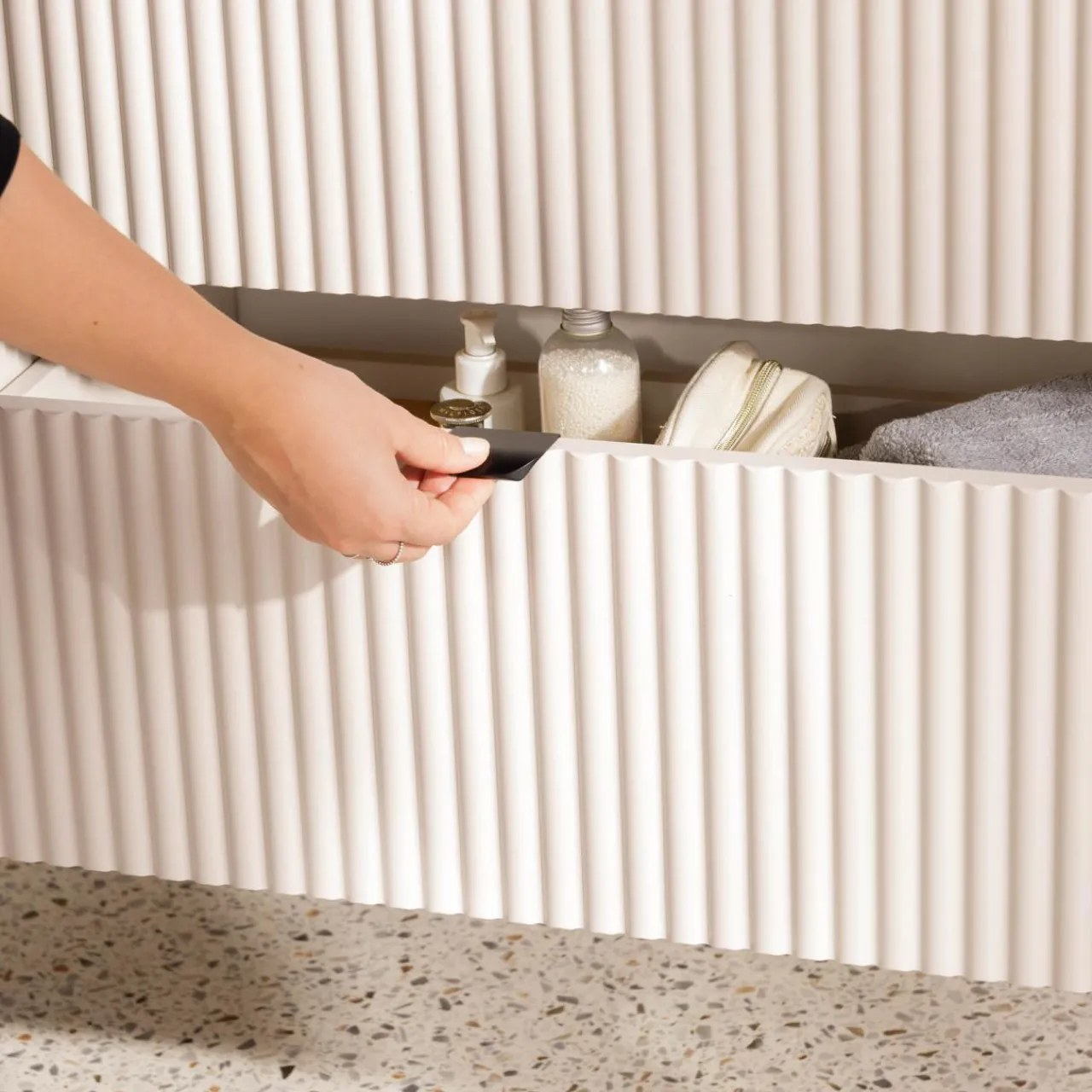 Z szafką umywalkową BELT nie zabraknie miejsca na akcesoria do łazienki. Suszarkę, żele pod prysznic i kosmetyki schowasz w 2 szufladach.
