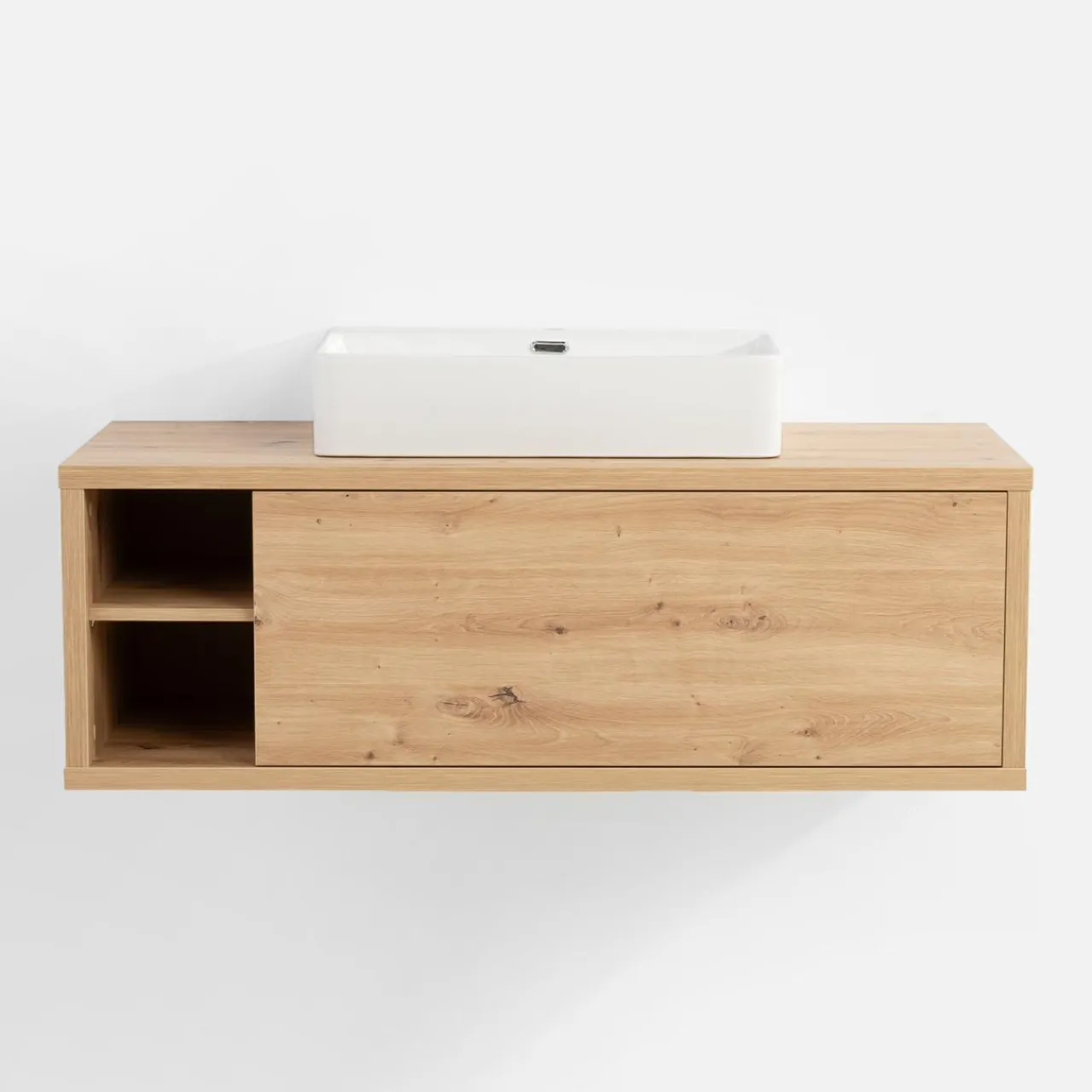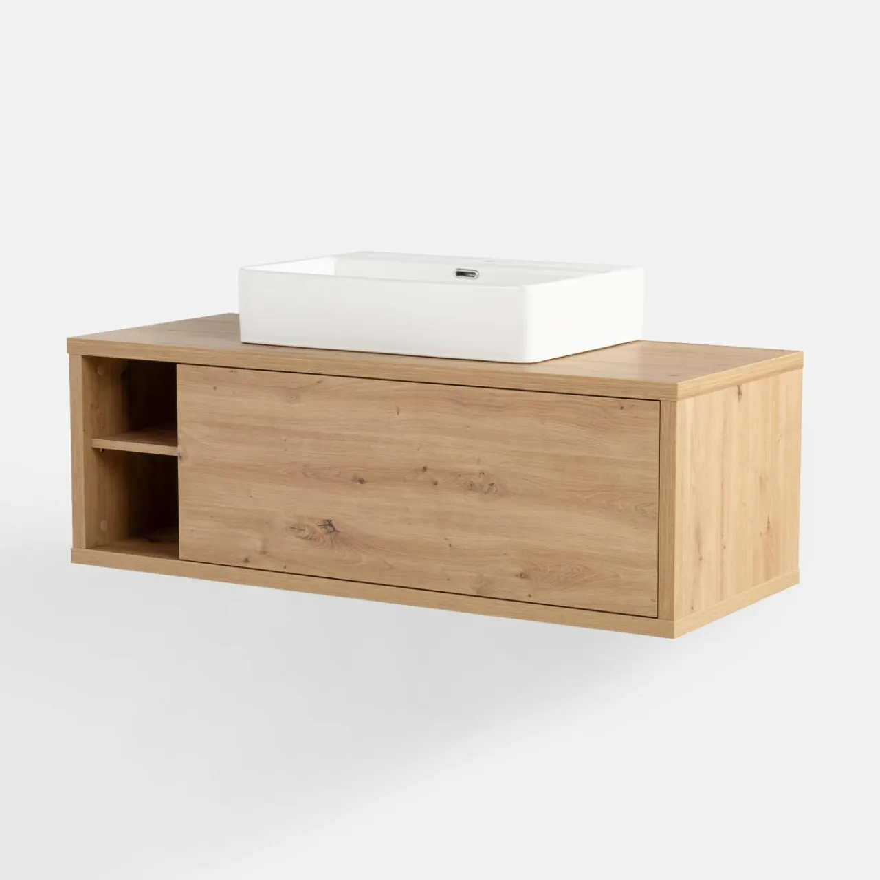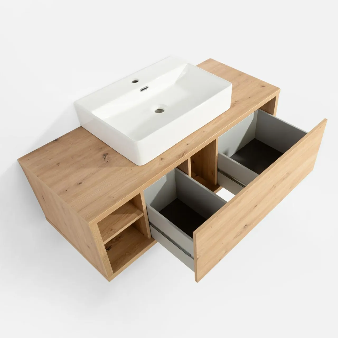 - Posiada szufladę oraz umieszczone obok niej 2 wnęki – idealnie dopasowane do przechowywania drobiazgów potrzebnych przy codziennej toalecie.
