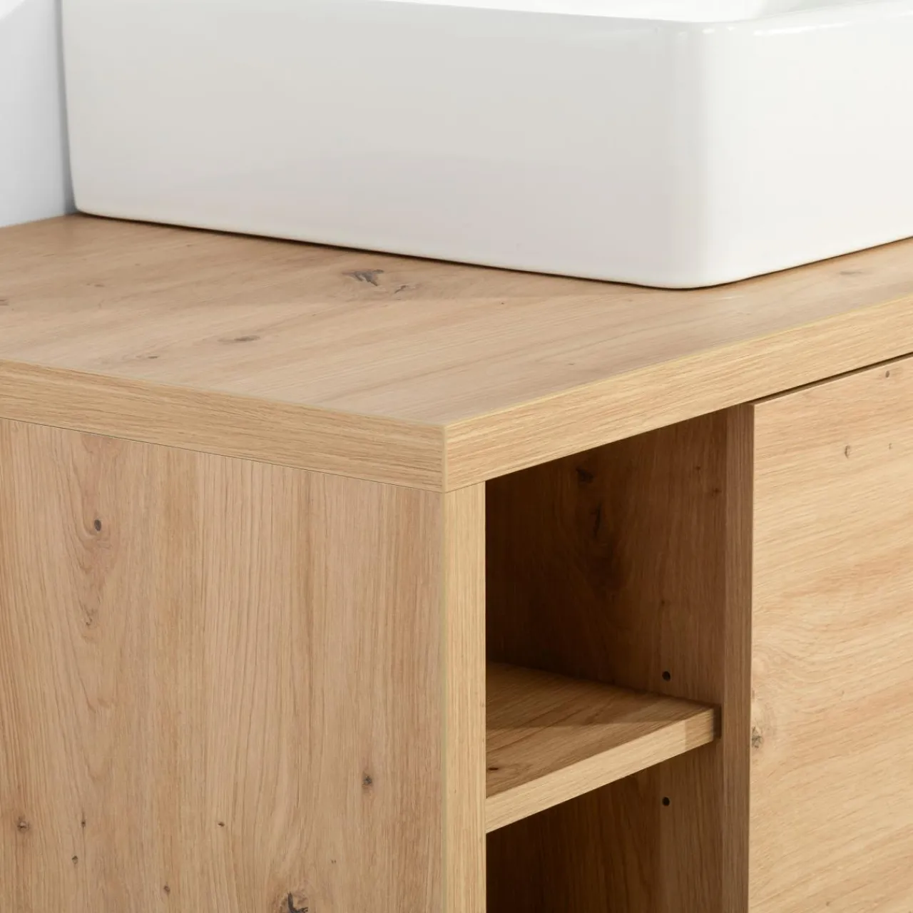 - Na półkach umieścisz mniejsze kosmetyki, a większe opakowania schowasz wewnątrz szafek. Półki oraz front szuflady mają grubość 16 mm.