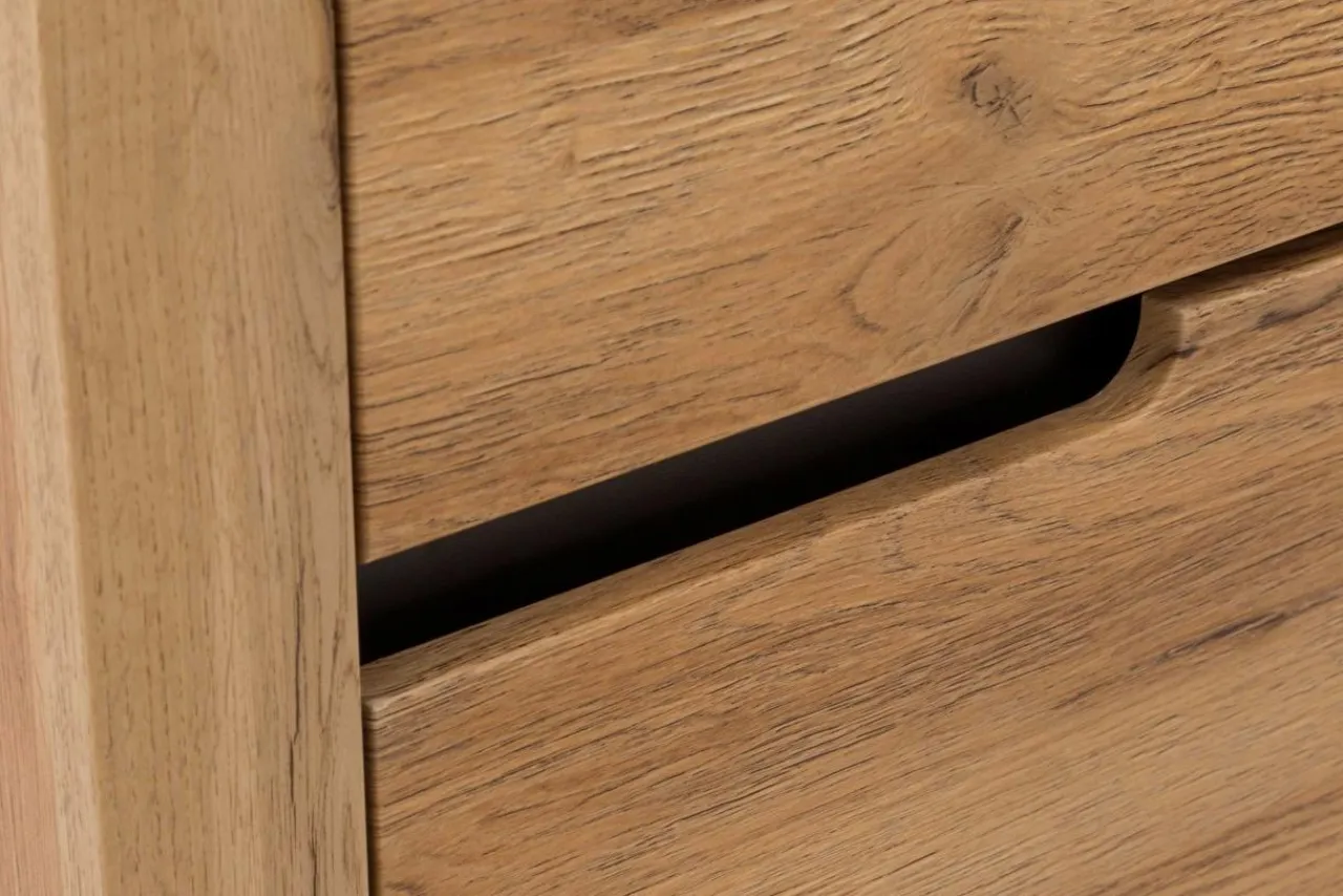 Korpus regału wykończono laminatem, imitującym strukturę drewna o ciepłej barwie „dębu wotan” (na tylnej ścianie – dąb złoty craft). Front pokryto folią PVC. Ciemny dekor współgra z nowoczesnymi elementami wykończenia.
