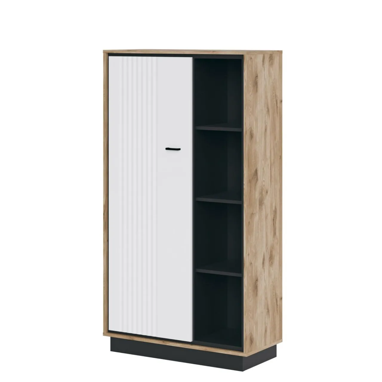 Białe drzwi z ozdobnym ryflowaniem sprawiają, że regał wygląda elegancko, nowocześnie i estetycznie.