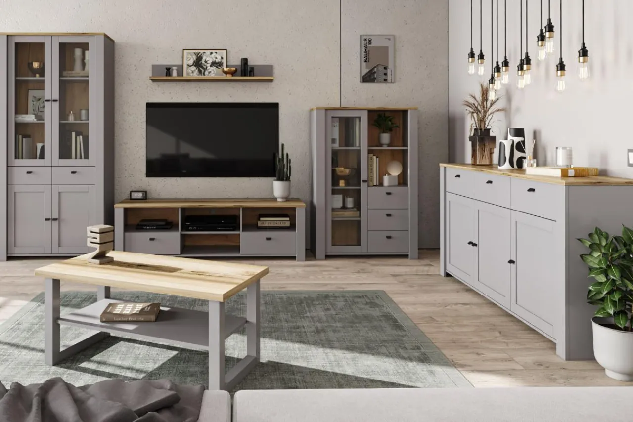 Szary kolor mebli w połączeniu z dębem delano sprawia, że meble są nowoczesne i będą pasowały do jasnych i ciemnych aranżacji.