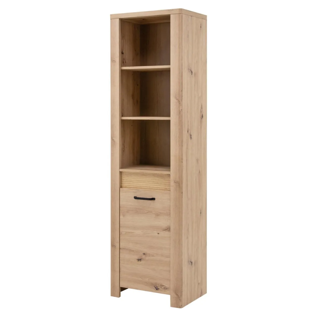 Regał MORIS posiada otwarte półki oraz zamykaną szafkę w dolnej części mebla.