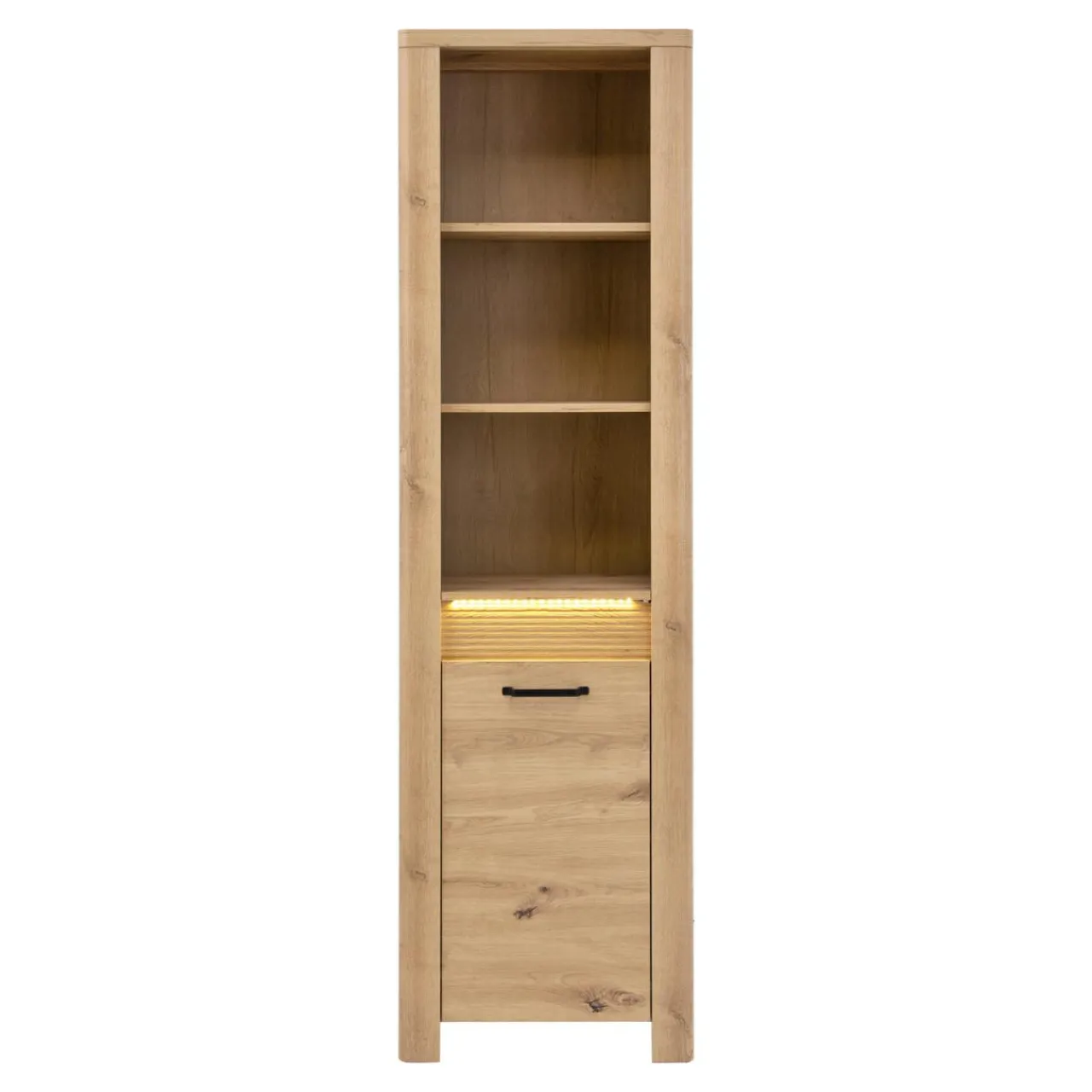 Regał MORIS posiada oświetlenie LED umieszczone przy ozdobnej części mebla pomiędzy jego górną i dolną częścią. Całość została wykonana z płyty meblowej, wykończonej laminatem.