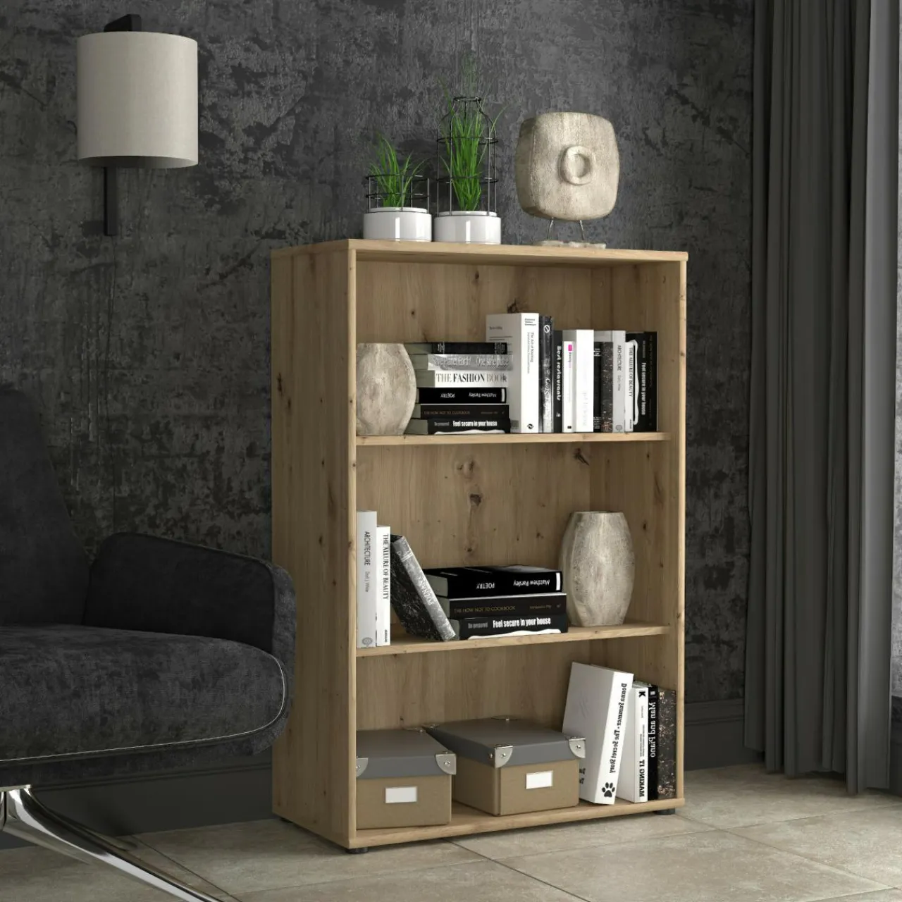 Kolorystyka dąb artisan o charakterystycznym wybarwieniu zbliżonym do naturalnego drewna umożliwia zestawienie regału z meblami w stylu nowoczesnym oraz skandynawskim. Ładnie komponuje się również z meblami osadzonymi na czarnych profilach.