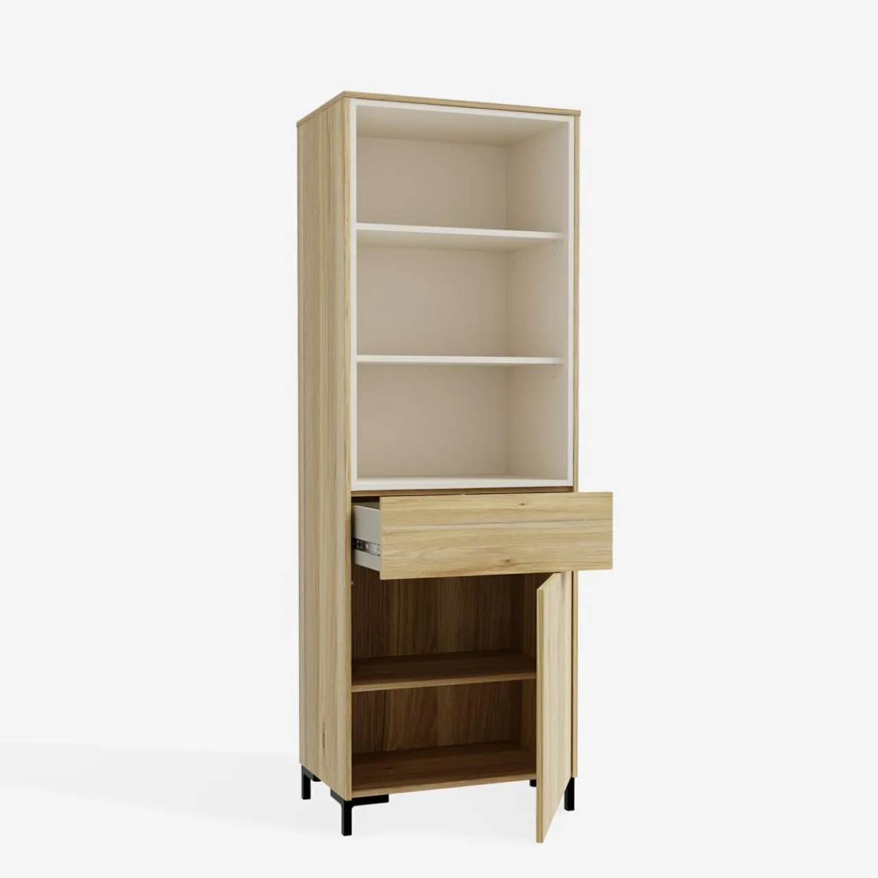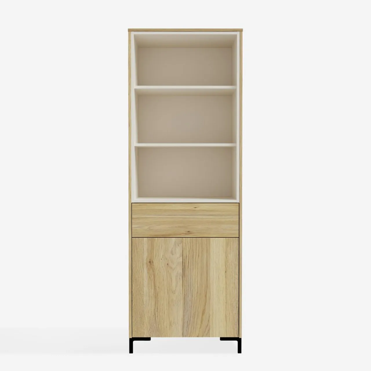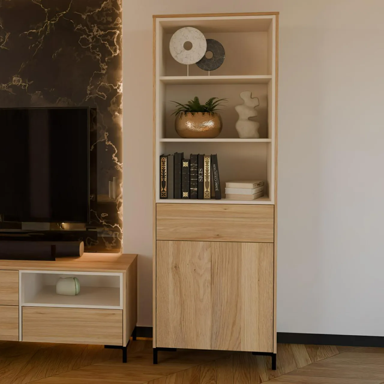 Regał GALACTIQUE jest częściowo zabudowany. Dekoracje, książki czy drobne rośliny postaw w otwartych wnękach i wyeksponuj je w salonie.