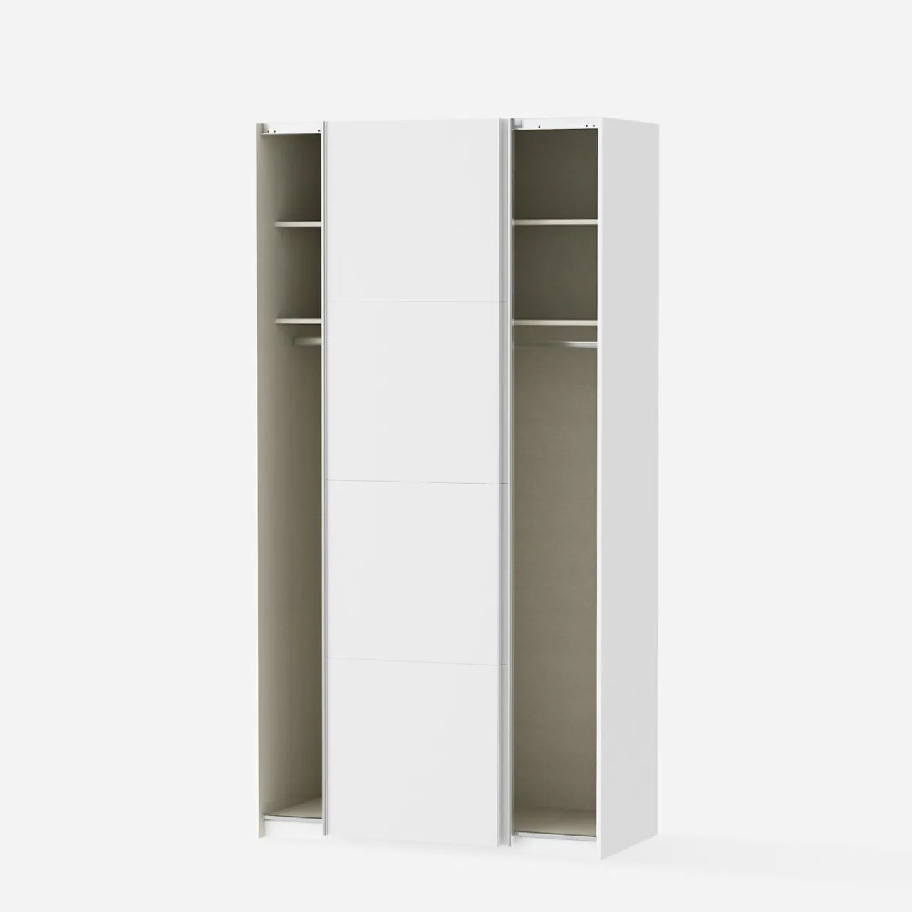 - Podzielona na dwie części — równomierne ułożenie półek i drążków w szafie umożliwia podzielenie wnętrza na różne sposoby; osobna część dla Ciebie i partnera lub dwójki rodzeństwa.