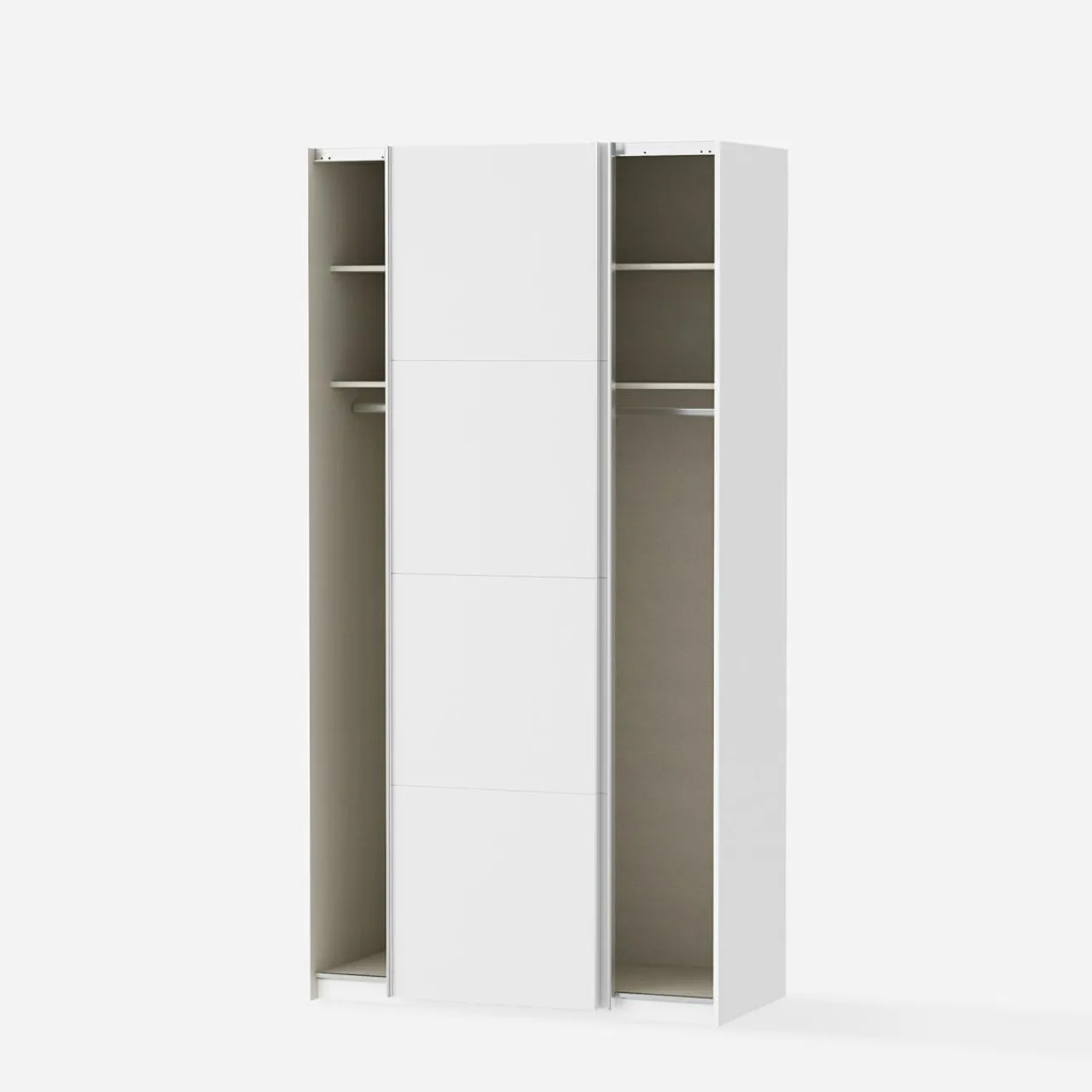 - Podzielona na dwie części — równomierne ułożenie półek i drążków w szafie umożliwia podzielenie wnętrza na różne sposoby; osobna część dla Ciebie i partnera lub dwójki rodzeństwa.