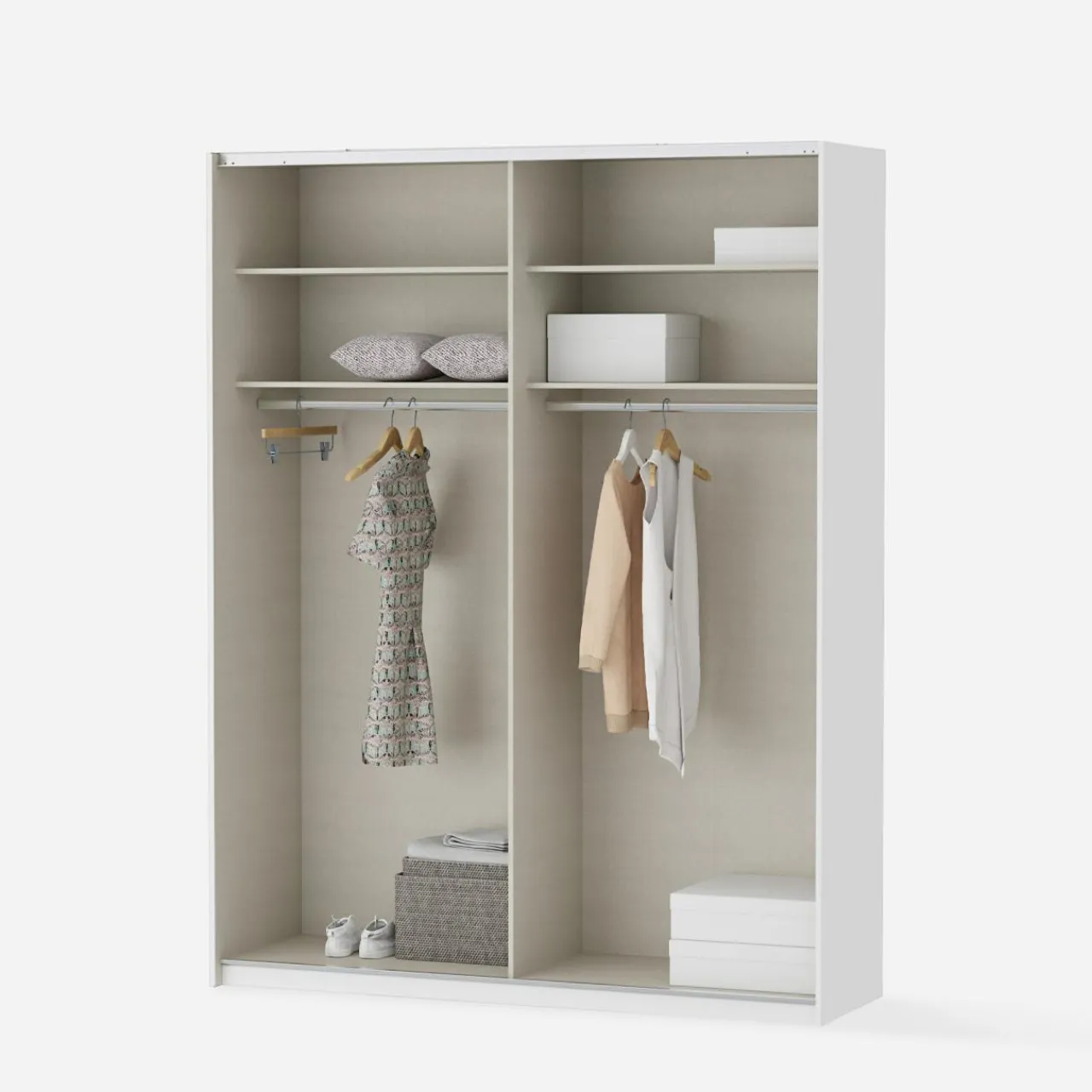 - Wnętrze gotowe na codzienność — wyposażone w 4 pojemne półki i 2 drążki na ubrania.