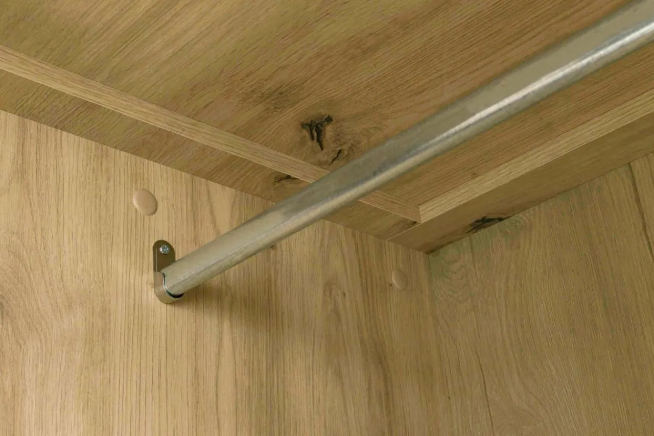 Szafa MORIS posiada przestronne wnętrze z podziałem na górną część, w której znajduje się drążek na ubrania. Dolna częśćmebla jest wyposazona w półkę.