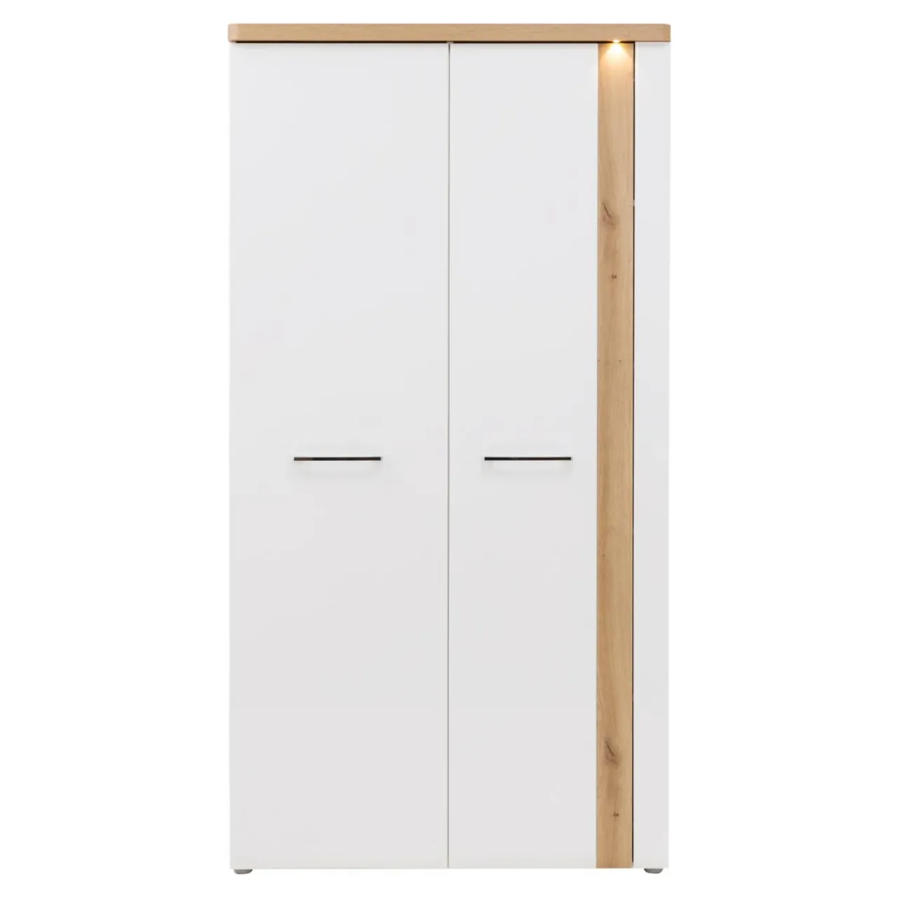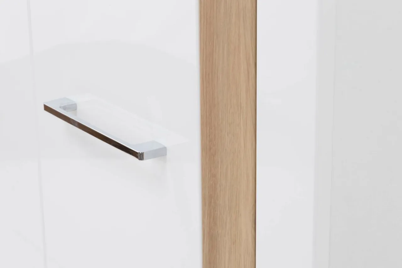 - W standardzie jest oświetlenie na froncie szafy pięknie podkreślające biel szafy oraz jej przełamanie dekorem w kolorze dębu artisan.
