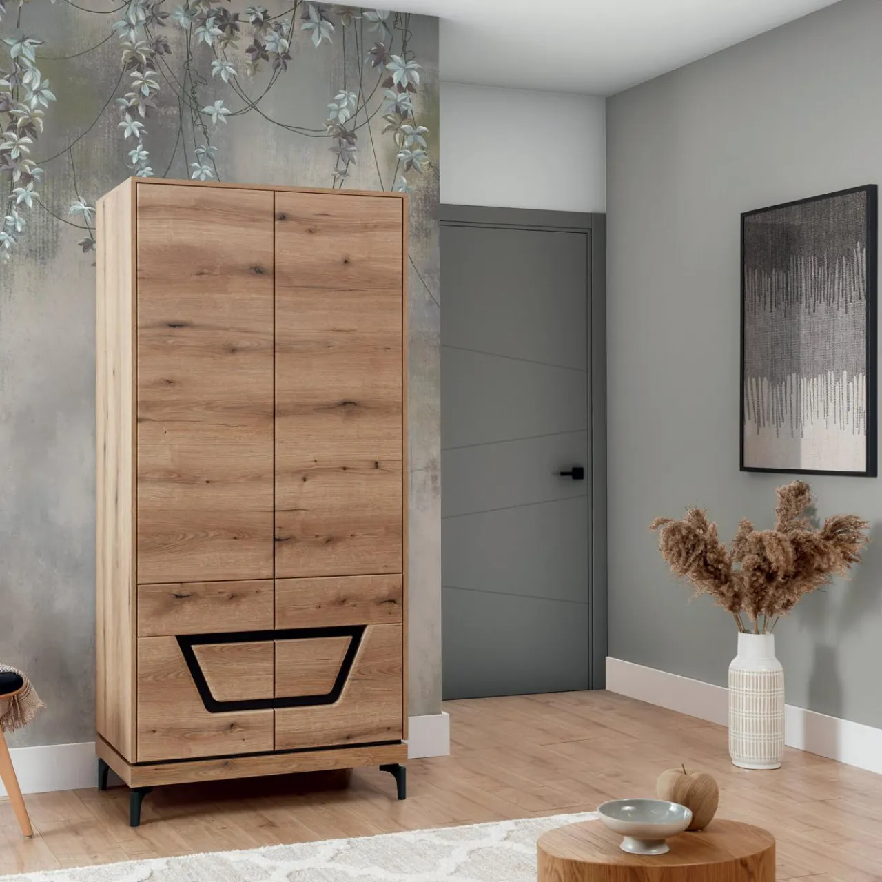 Jasne meble do salonu – kontrast rysunku drewna i czarnego dekoru