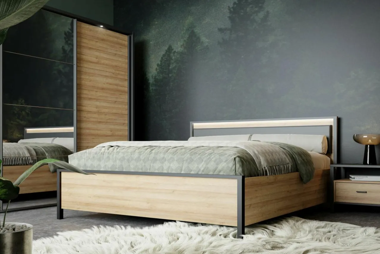 - Połączenie dekoru dąb riviera z pełną głębi czernią obramowania to zestawienie, które przyciągnie uwagę ładnie dobranym kontrastem kolorów oraz prostotą i surowością w kształcie brył