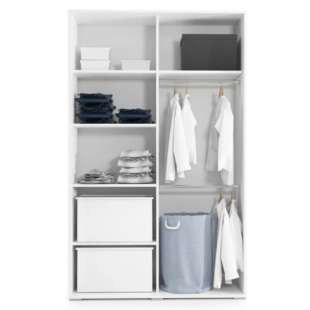 Zyskaj spokój ducha i uporządkowaną przestrzeń z szafą ALFA o szerokości 150 cm. Bałagan w sypialni lub przedpokoju z łatwością opanujesz dzięki 6 wnękom i 2 drążkom.