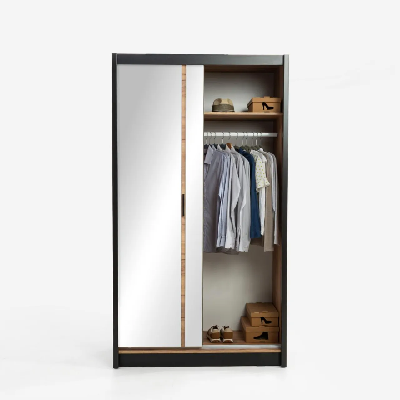 - Świetnie skomponowane wnętrze — oddzielone od siebie wnęki i część z drążkiem umożliwiają przechowywanie zarówno złożonych ubrań i dodatków, jak i zawieszenia na wieszakach.