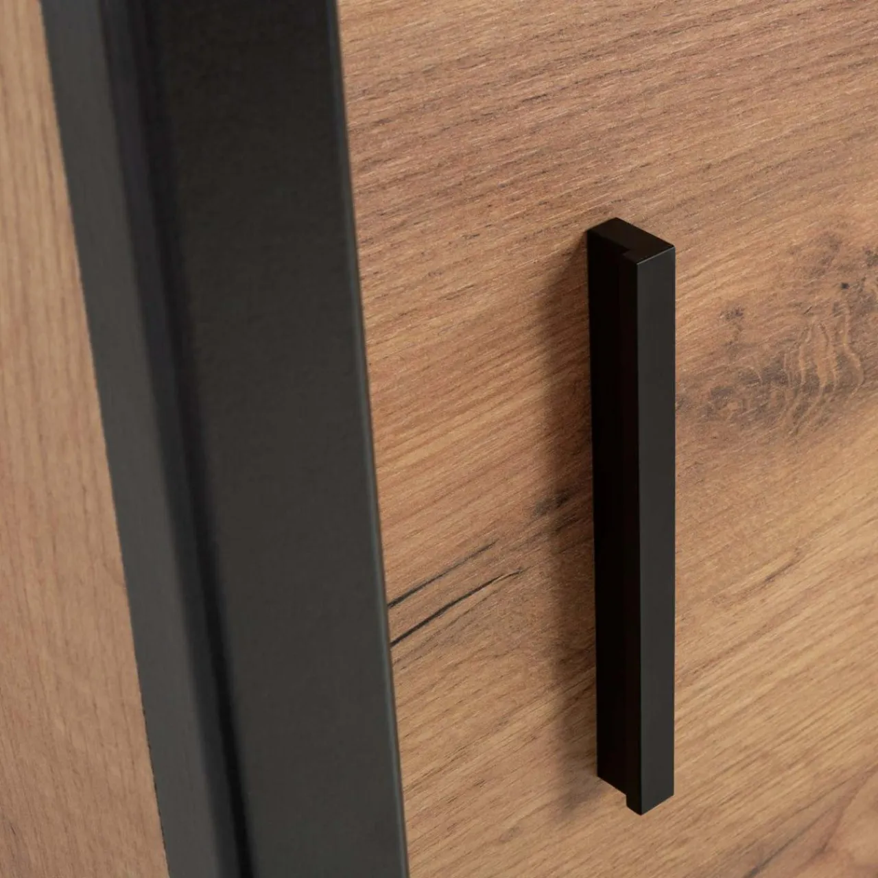 - Przytulny klimat — ciepły odcień dębu podkreślony jest kontrastowymi czarnymi listwami. Połączenie 2 kolorów sprawdzi się we wnętrzu zaaranżowanym w jasnej, ale również ciemnej kolorystyce.