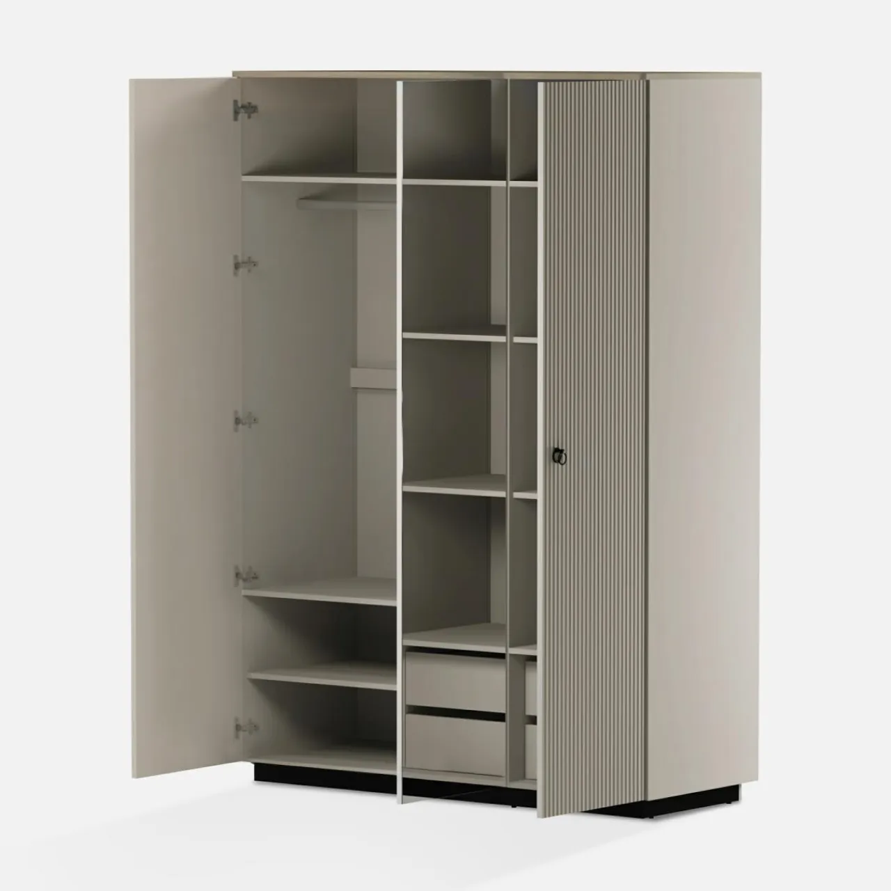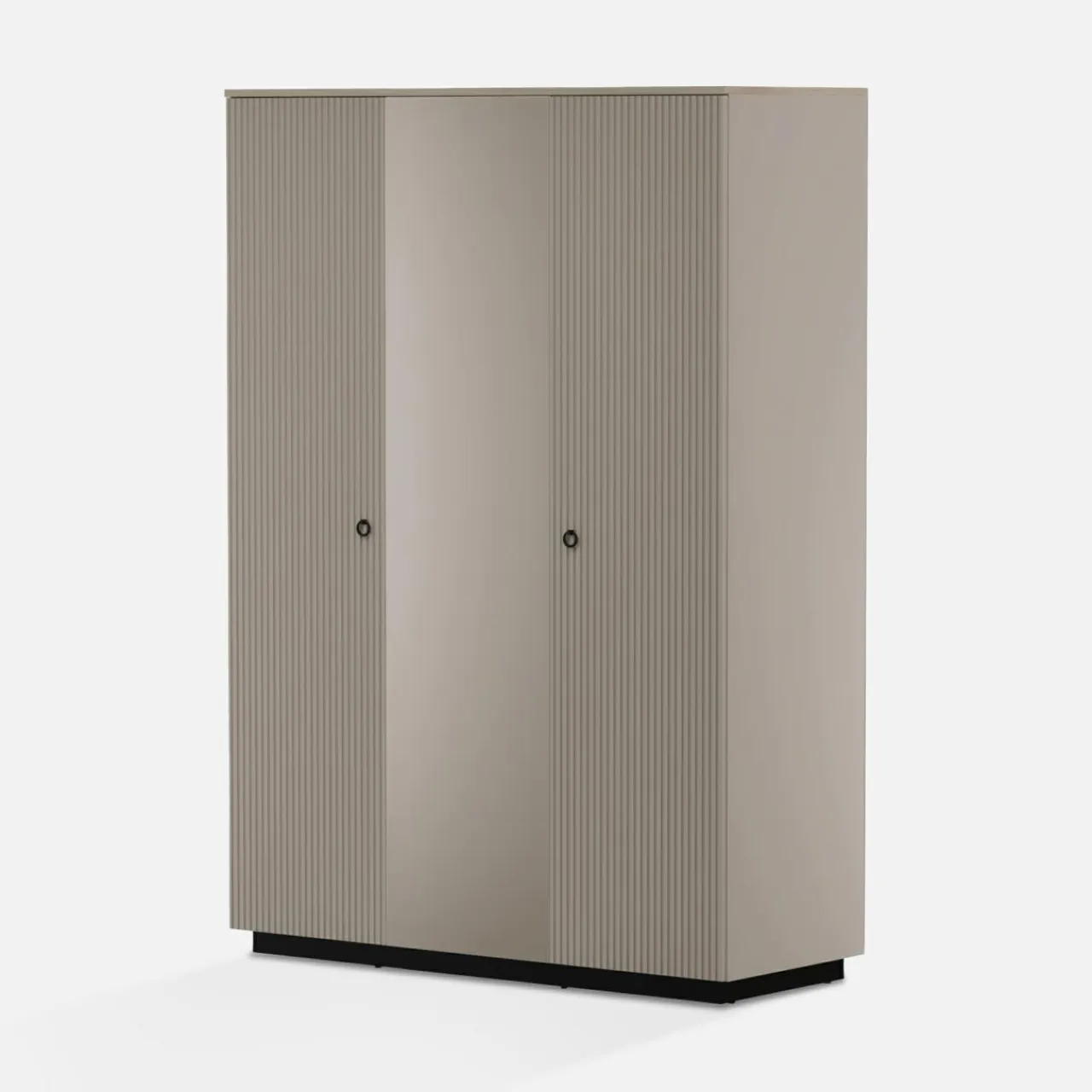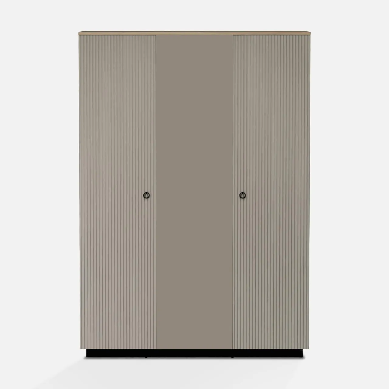 - Ryflowane fronty w kolorze taupe idealnie zgrywają się z korpusami. Wykończone są laminatem i folią.