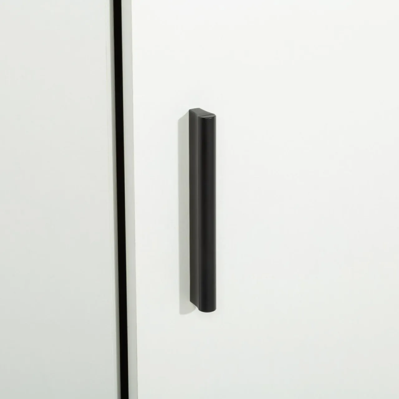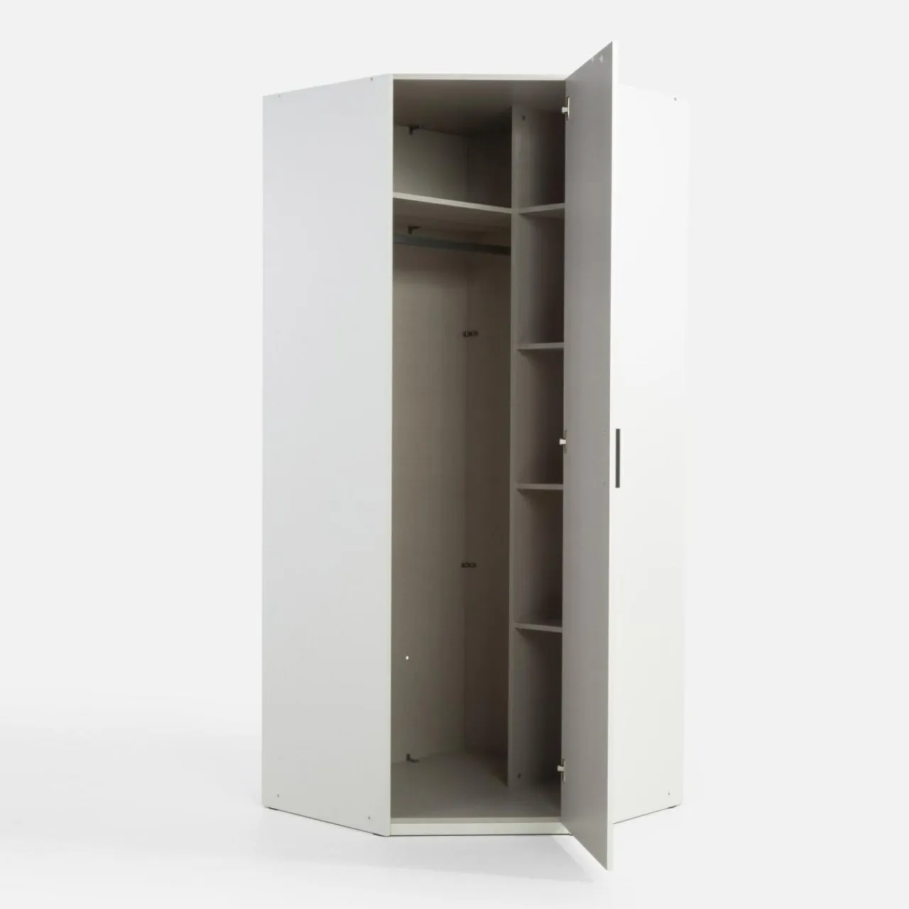 Szafa narożna TRAWEN zabuduje róg pomieszczenia, maksymalnie wykorzystując przestrzeń. W środku znajdują się półki i drążek na ubrania, dzięki którym każda część garderoby będzie miała swoje miejsce.