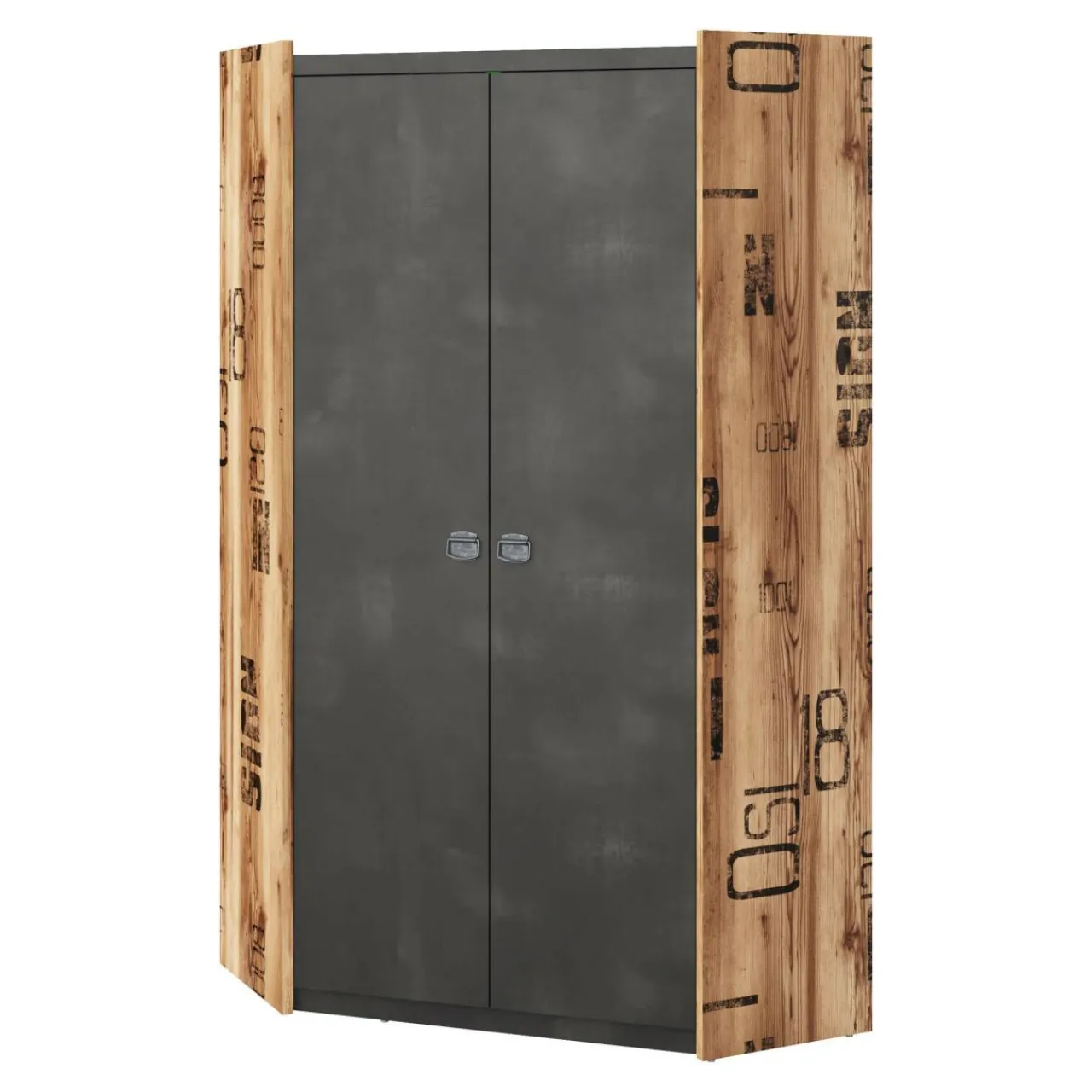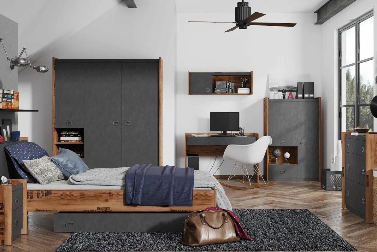 Fronty przypominające strukturą beton zostały zestawione z korpusami wykończonymi okleiną w ciepłym dekorze drewna zdobionej dekoracyjnym nadrukiem. Takie połączenie tworzy harmonijny duet podkreślając jednocześnie nieszablonowy charakter mebla.