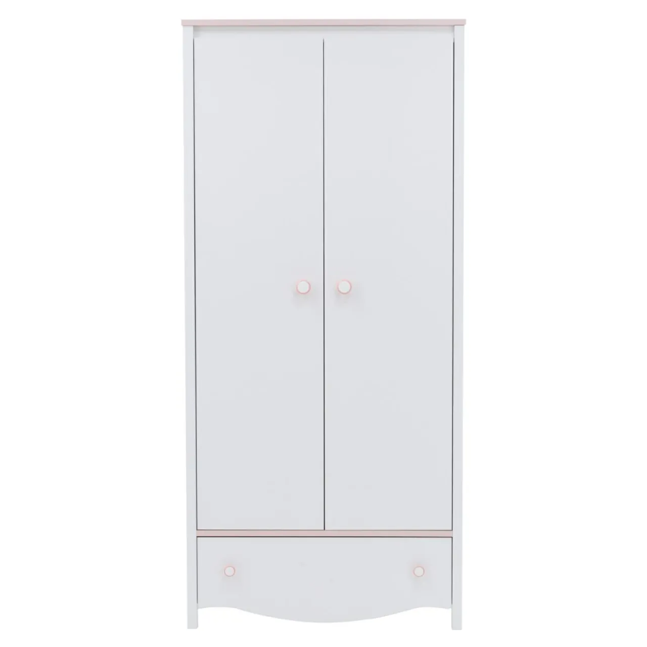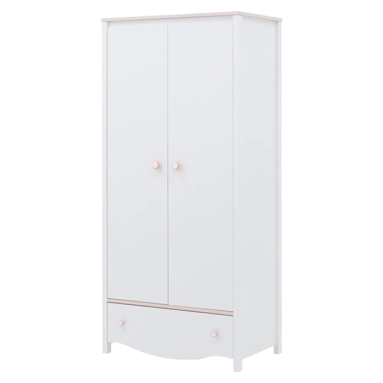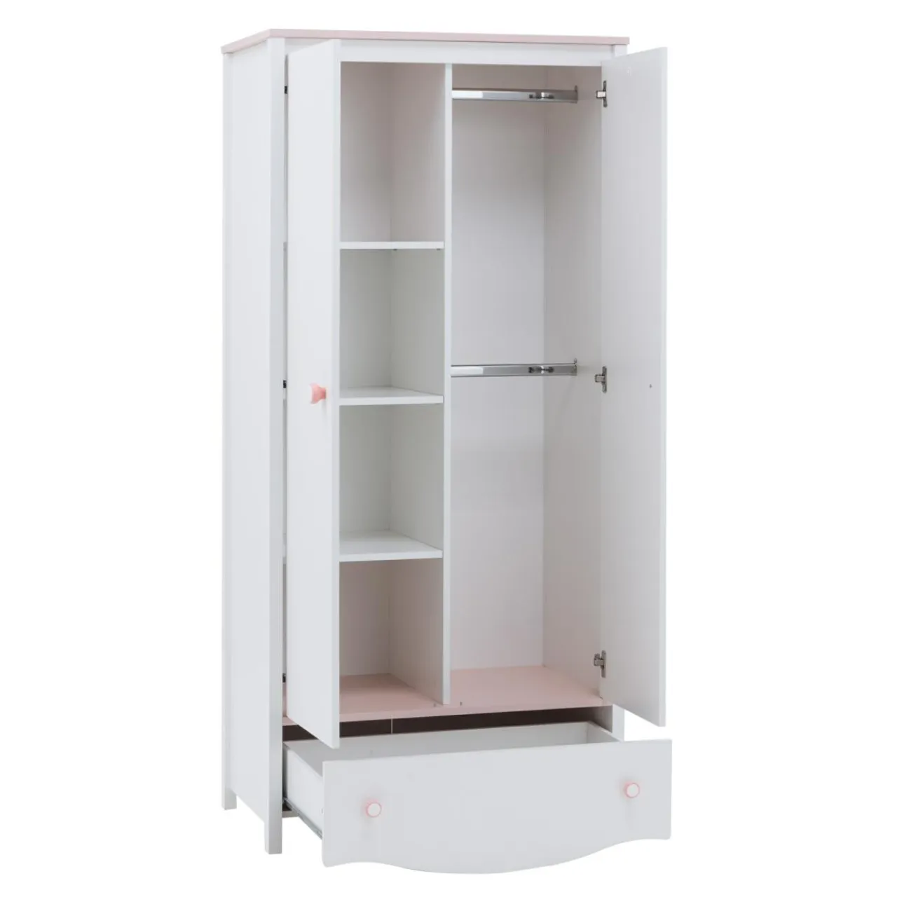 W meblu zamontowano aż dwa drążki do wieszania sukienek, spódnic i tunik. Szafa umożliwia uporządkowanie dużej ilości ubrań, które można poukładać na czterech pojemnych półkach. Miejsca na dziewczęce bibeloty nie zabraknie, dzięki pojemnej szufladzie na bieliznę i dodatki, umieszczonej w dolnej części szafy.