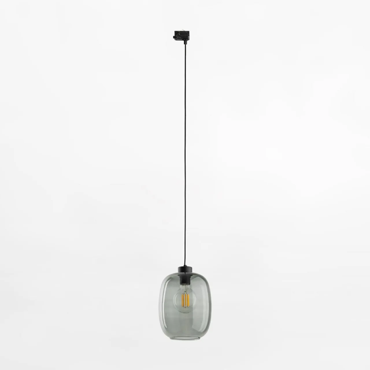 - Górna część oprawy i mocowanie do szyny są w czarnym, matowym kolorze. Dolna posiada grafitowy, lekko dekorowany klosz, który mieści 1 żarówkę typu E27.